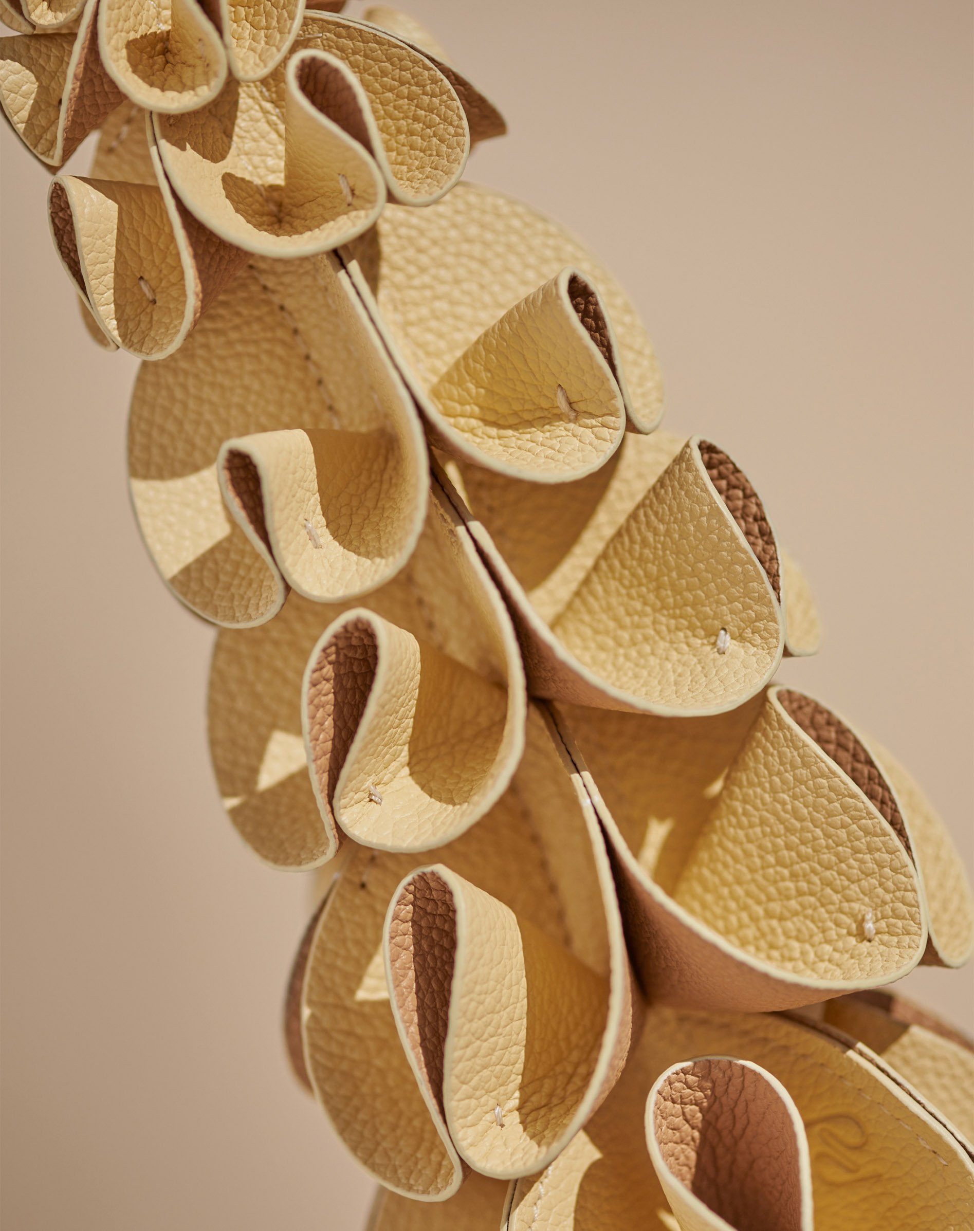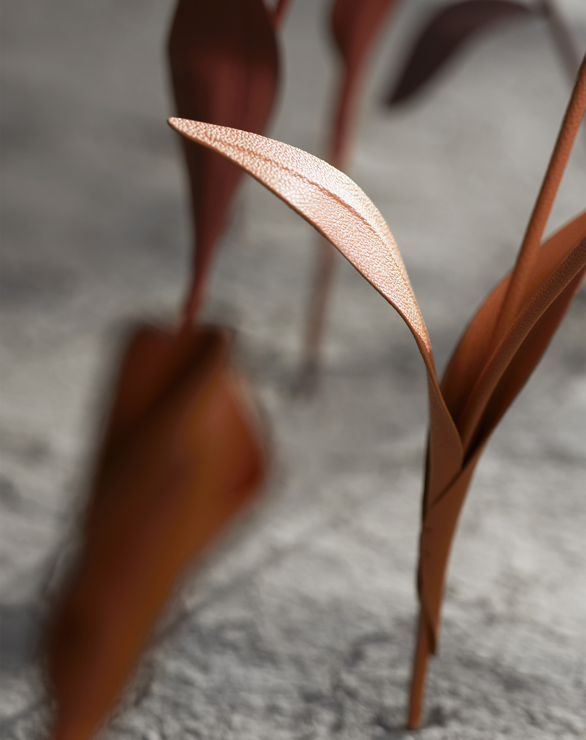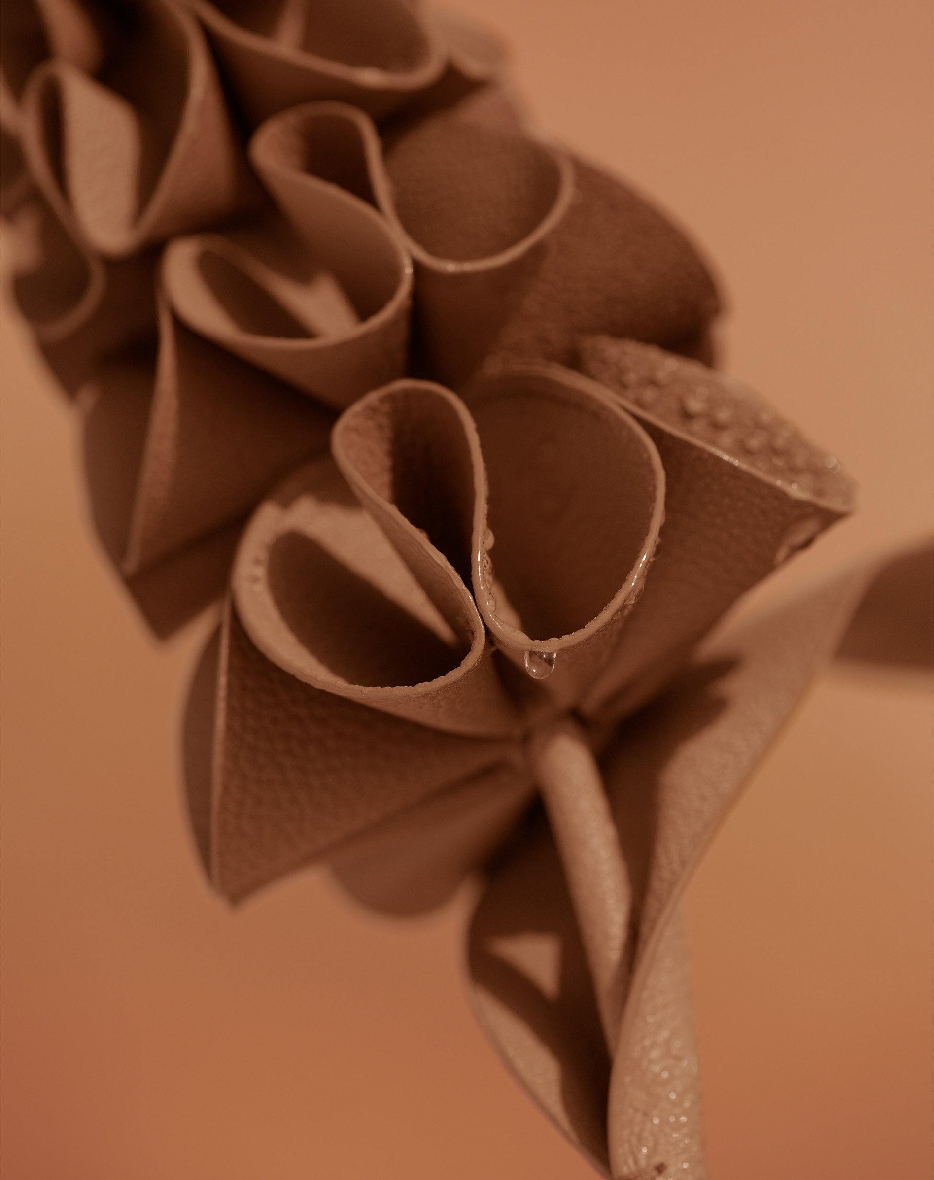 季節の移り変わりや、植物の開花を見せる自然は、まさに再生の象徴。ポレーヌは、豊かで守られた自然の証である開花という現象にインスピレーションを受け、レザーの端切れから永遠の花の姿を描き出しました。