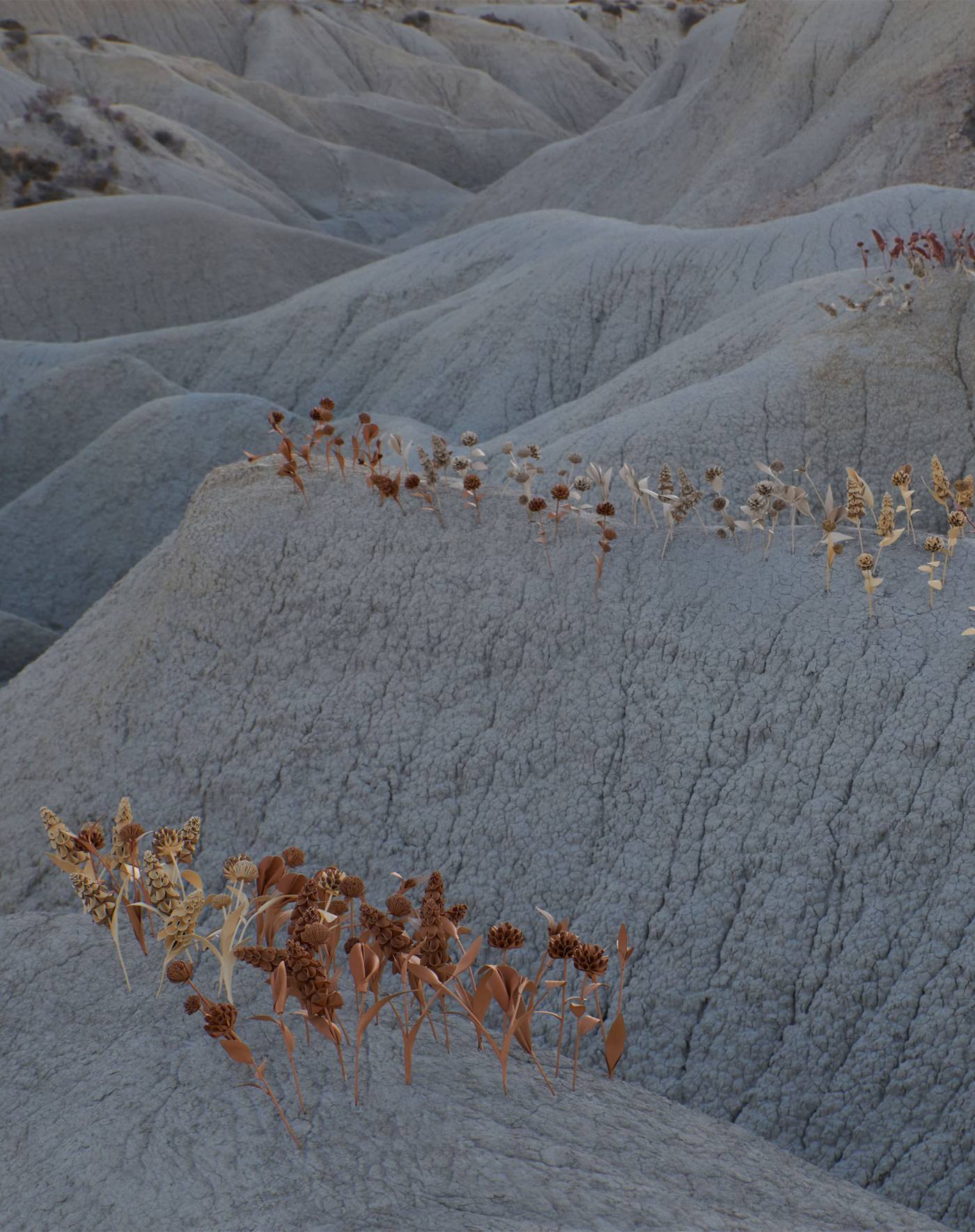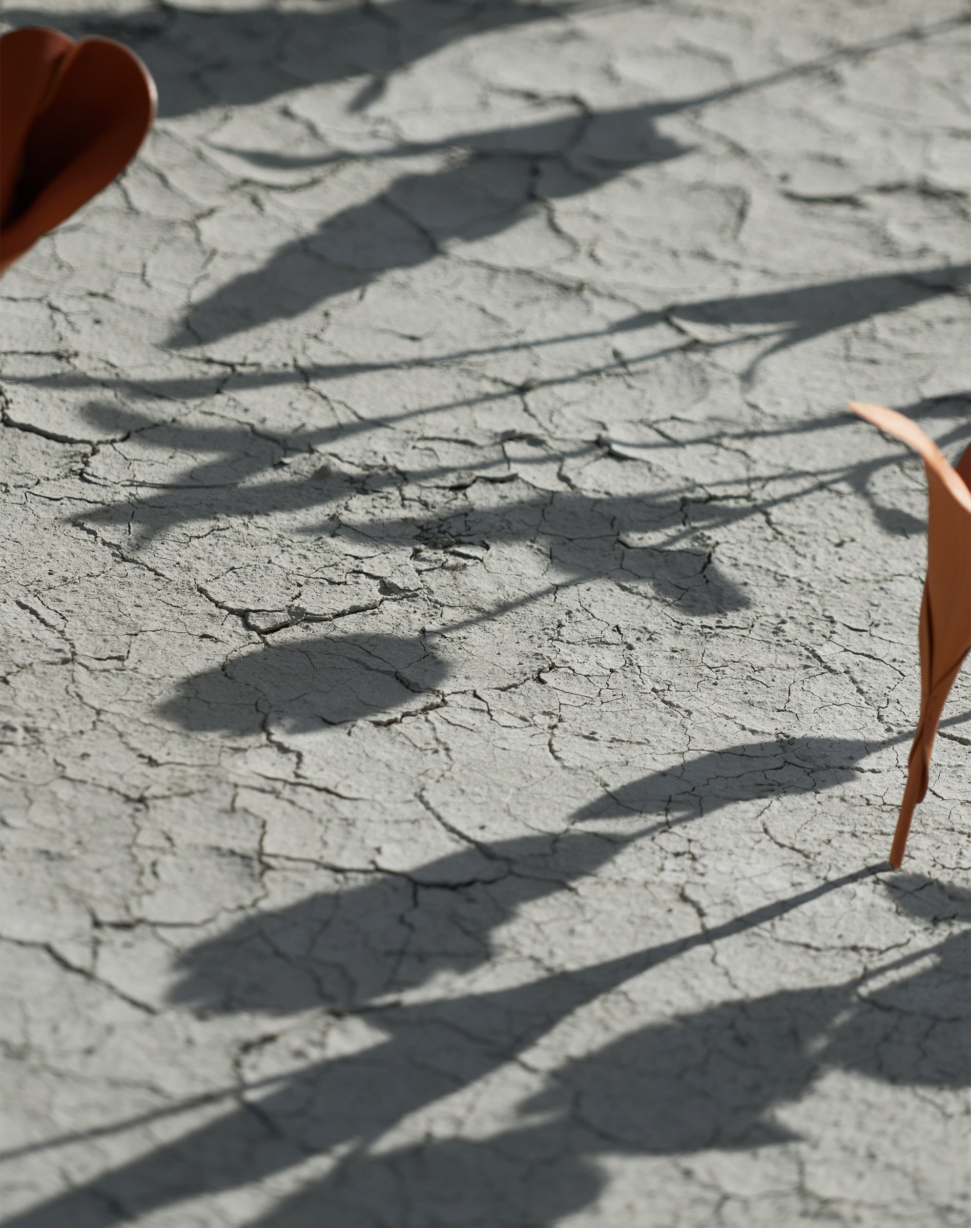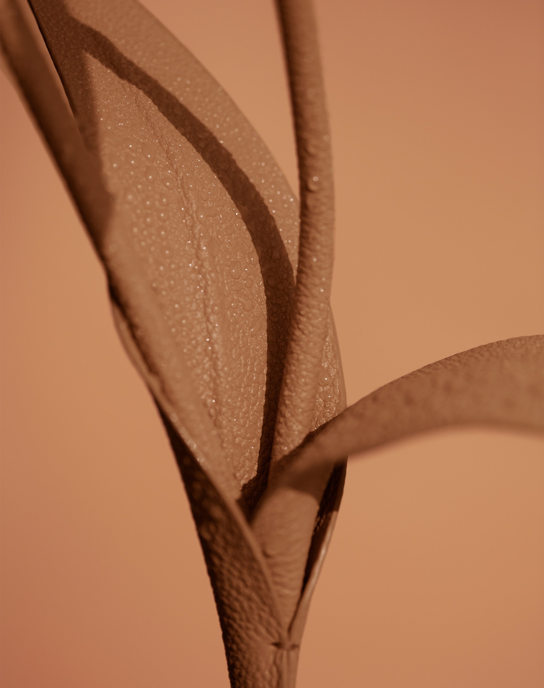 季節の移り変わりや、植物の開花を見せる自然は、まさに再生の象徴。ポレーヌは、豊かで守られた自然の証である開花という現象にインスピレーションを受け、レザーの端切れから永遠の花の姿を描き出しました。