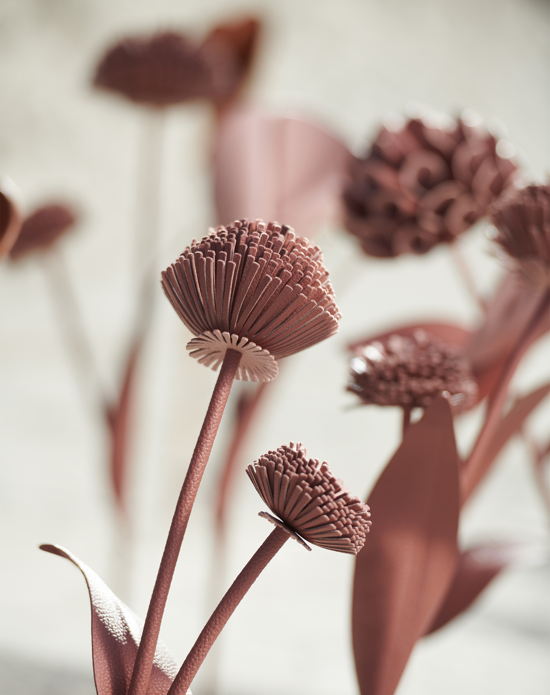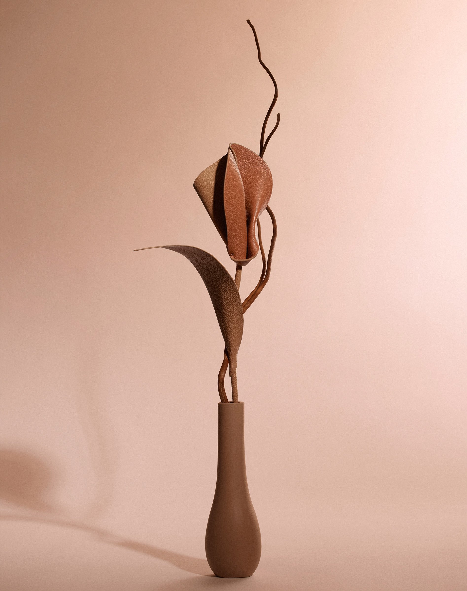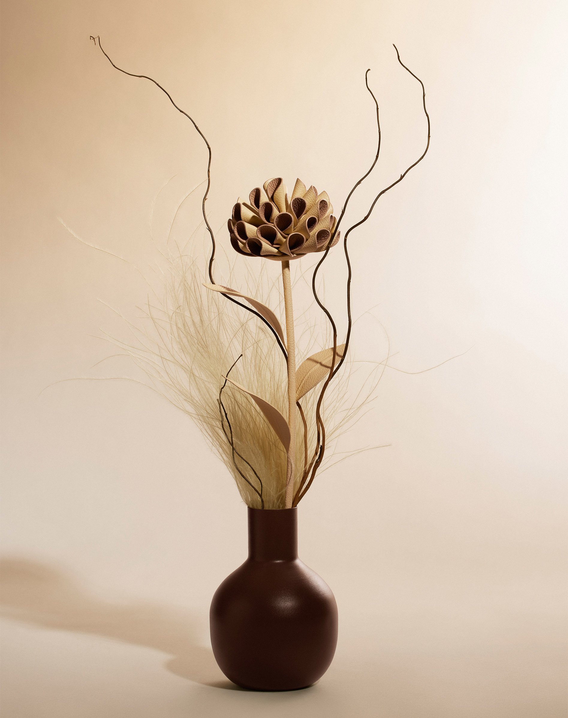 革の端切れに込められたクリエイティビティが花開き、インテリアを彩ります。ダリアの花の彫刻的な幾何学模様を思わせる「Dalium」の花。円錐形のフォルムが藤の花をプリーツで折り畳み、円形を描く花弁がランの優雅さを連想させる「Orki」の花。アルムの花のピュアなエレガンスを再解釈した「Pili」の花。野に咲く花のような、軽やかなフォルムが印象的な「Tul」の花。そして、極楽鳥花から着想を得た直線的な造形が目を引く「Touka」の花。どの花も、一輪挿しに活けたり、他のレザーフラワーと組み合わせたりするのはもちろん、ドライフラワーのブーケに添えてもお楽しみいただけます。