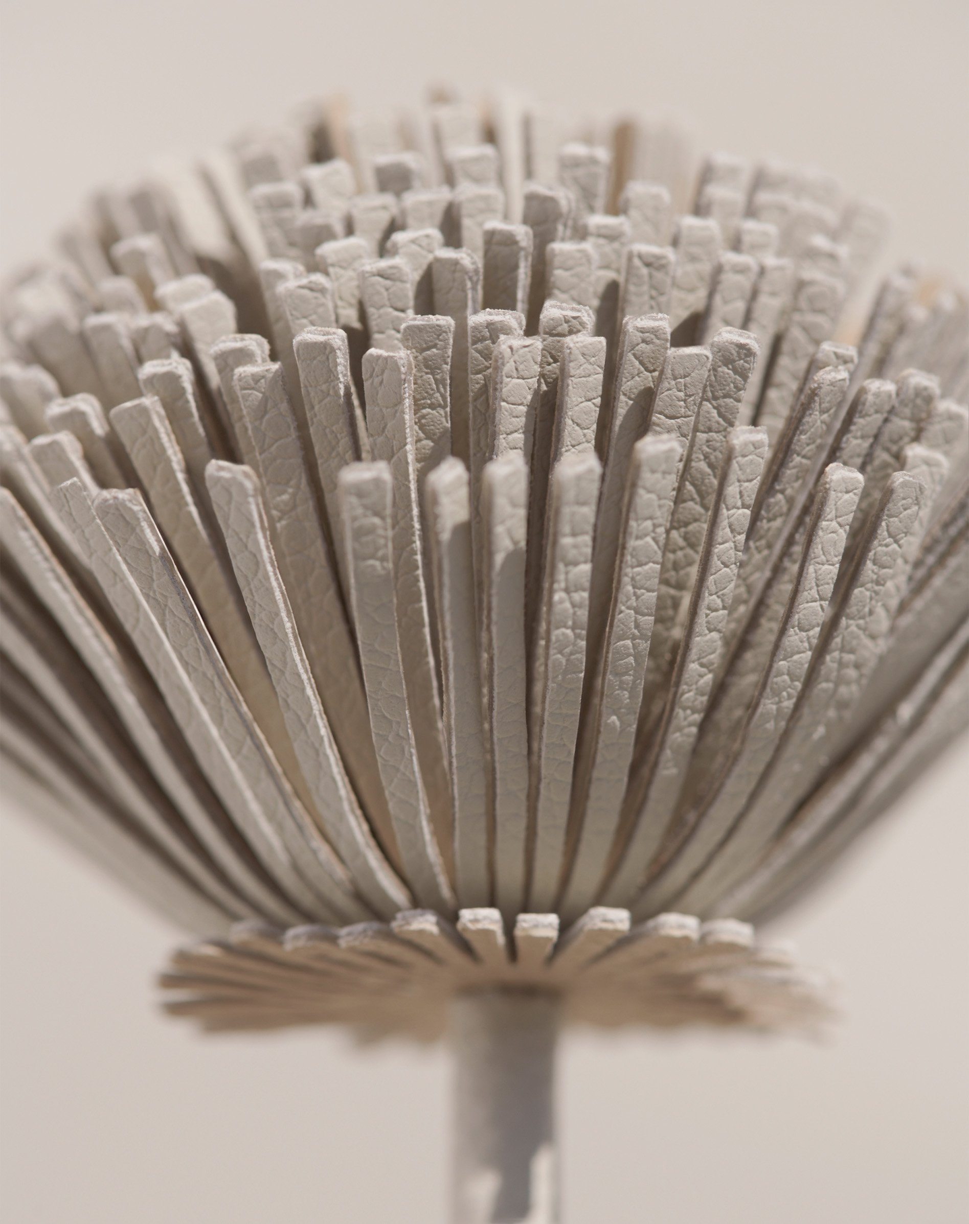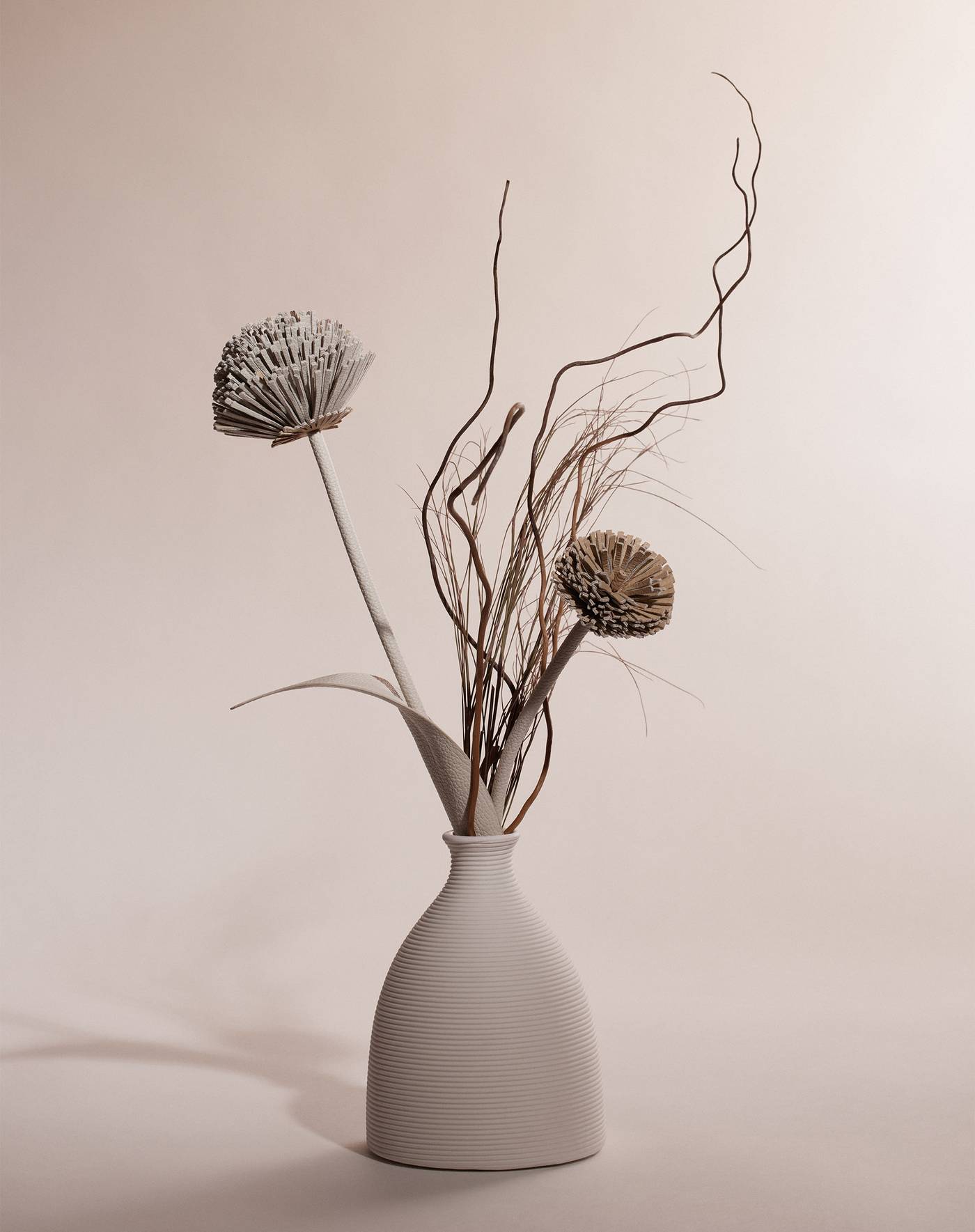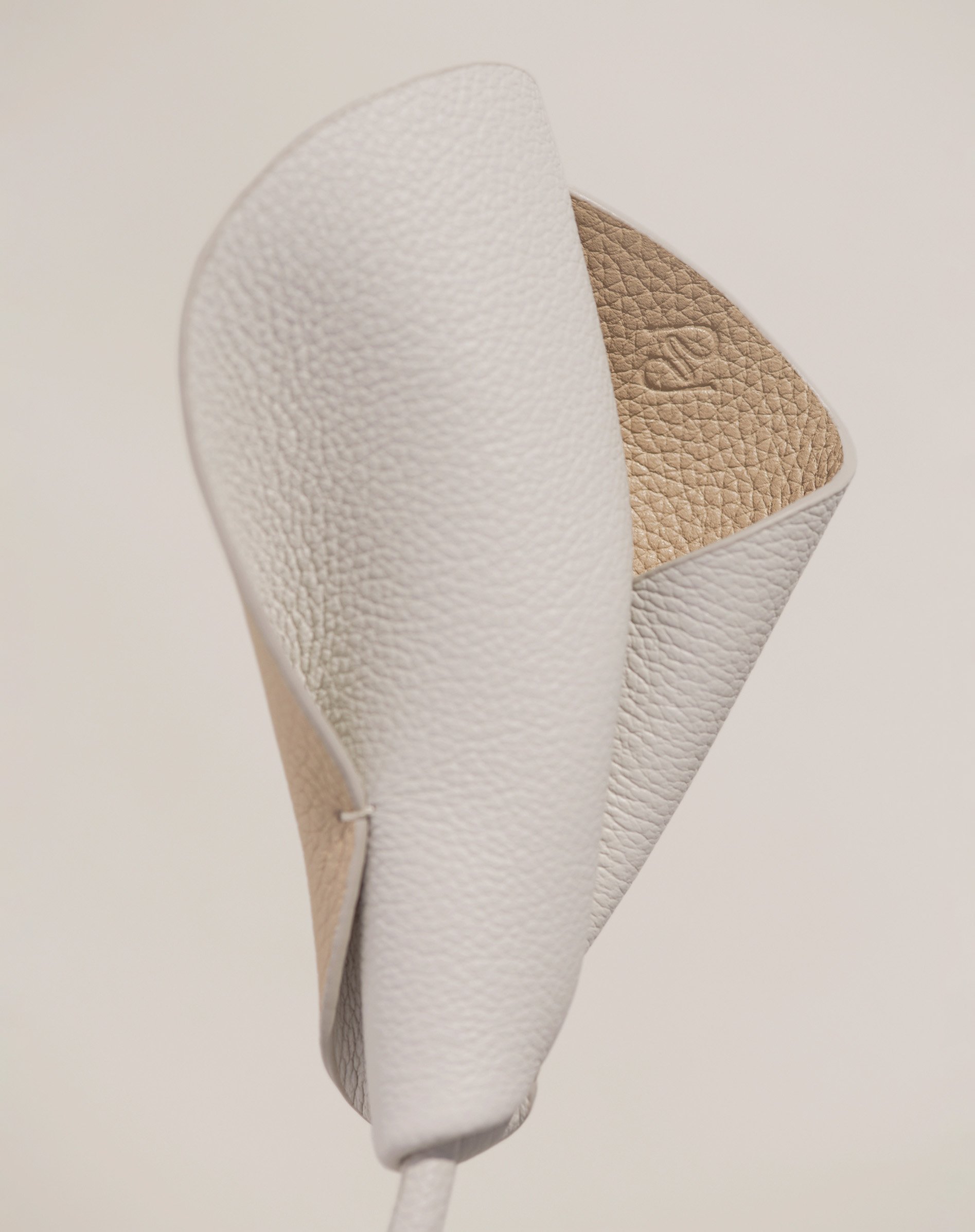 革の端切れに込められたクリエイティビティが花開き、インテリアを彩ります。ダリアの花の彫刻的な幾何学模様を思わせる「Dalium」の花。円錐形のフォルムが藤の花をプリーツで折り畳み、円形を描く花弁がランの優雅さを連想させる「Orki」の花。アルムの花のピュアなエレガンスを再解釈した「Pili」の花。野に咲く花のような、軽やかなフォルムが印象的な「Tul」の花。そして、極楽鳥花から着想を得た直線的な造形が目を引く「Touka」の花。どの花も、一輪挿しに活けたり、他のレザーフラワーと組み合わせたりするのはもちろん、ドライフラワーのブーケに添えてもお楽しみいただけます。