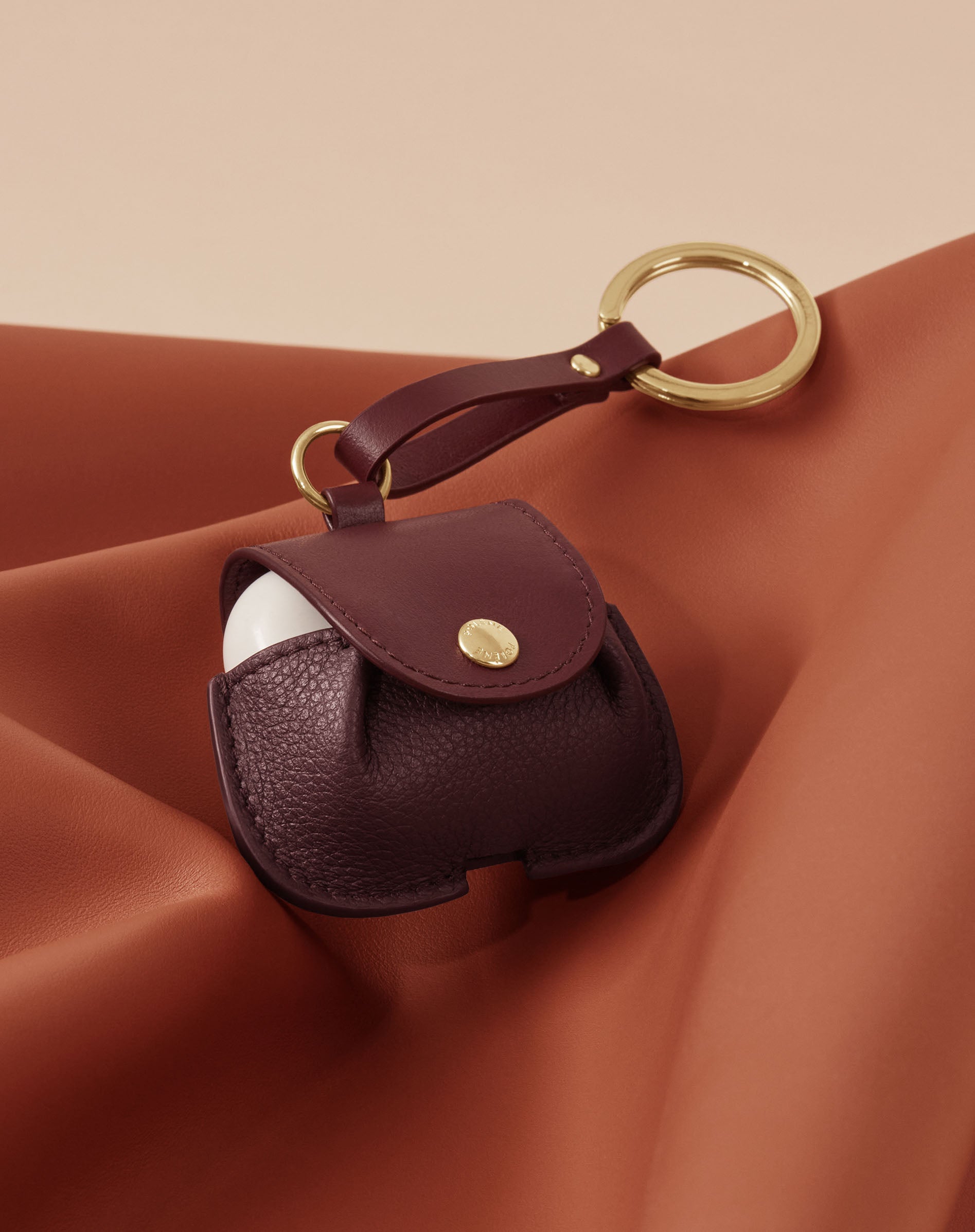 「Number One」のエアーポッズホルダーは、ポレーヌのフラッグシップバッグの象徴的なコードを反映しており、手縫いのプリーツや半月型のフラップが備わっています。刻印入りのスナップで開閉し、キーリングで留められます。