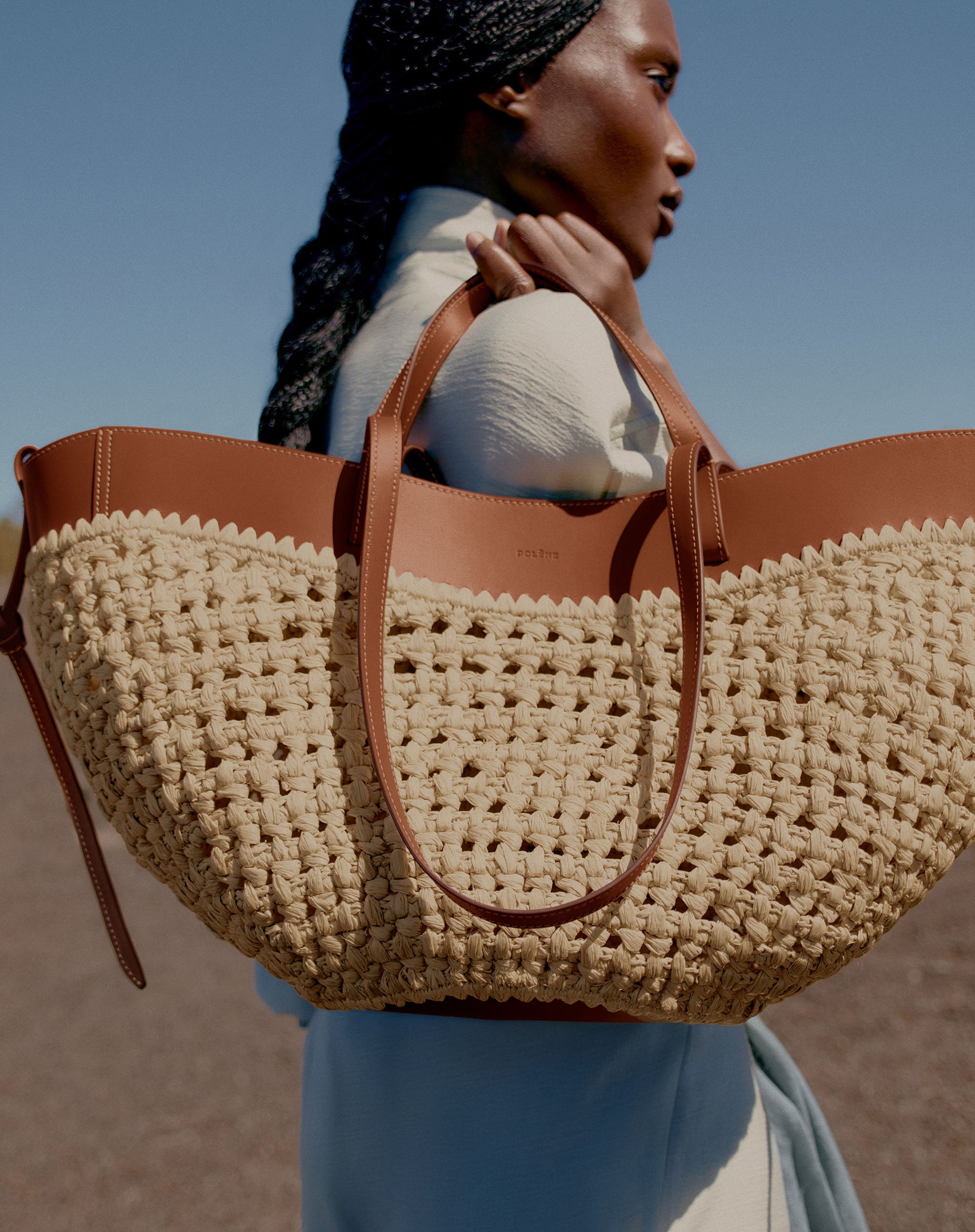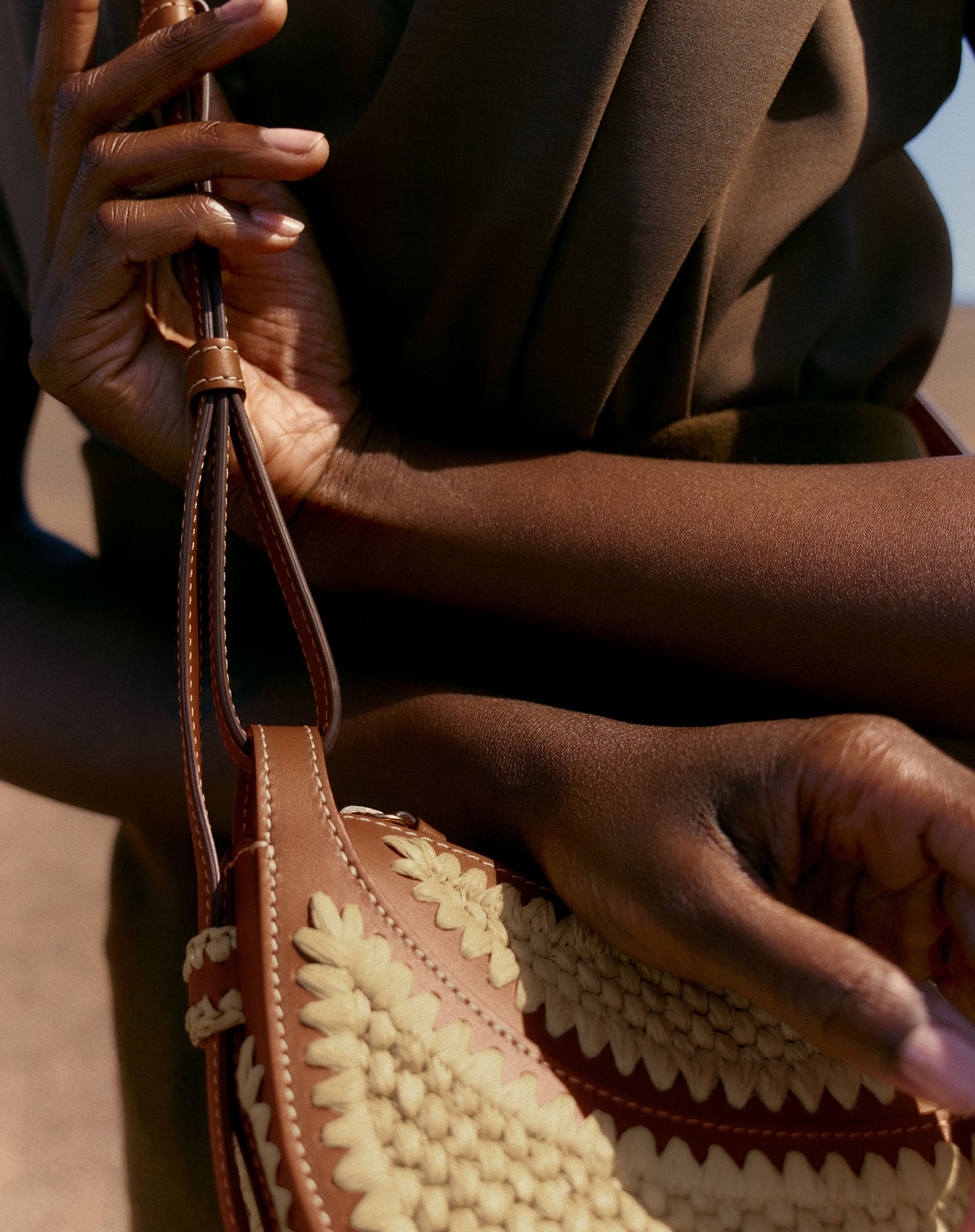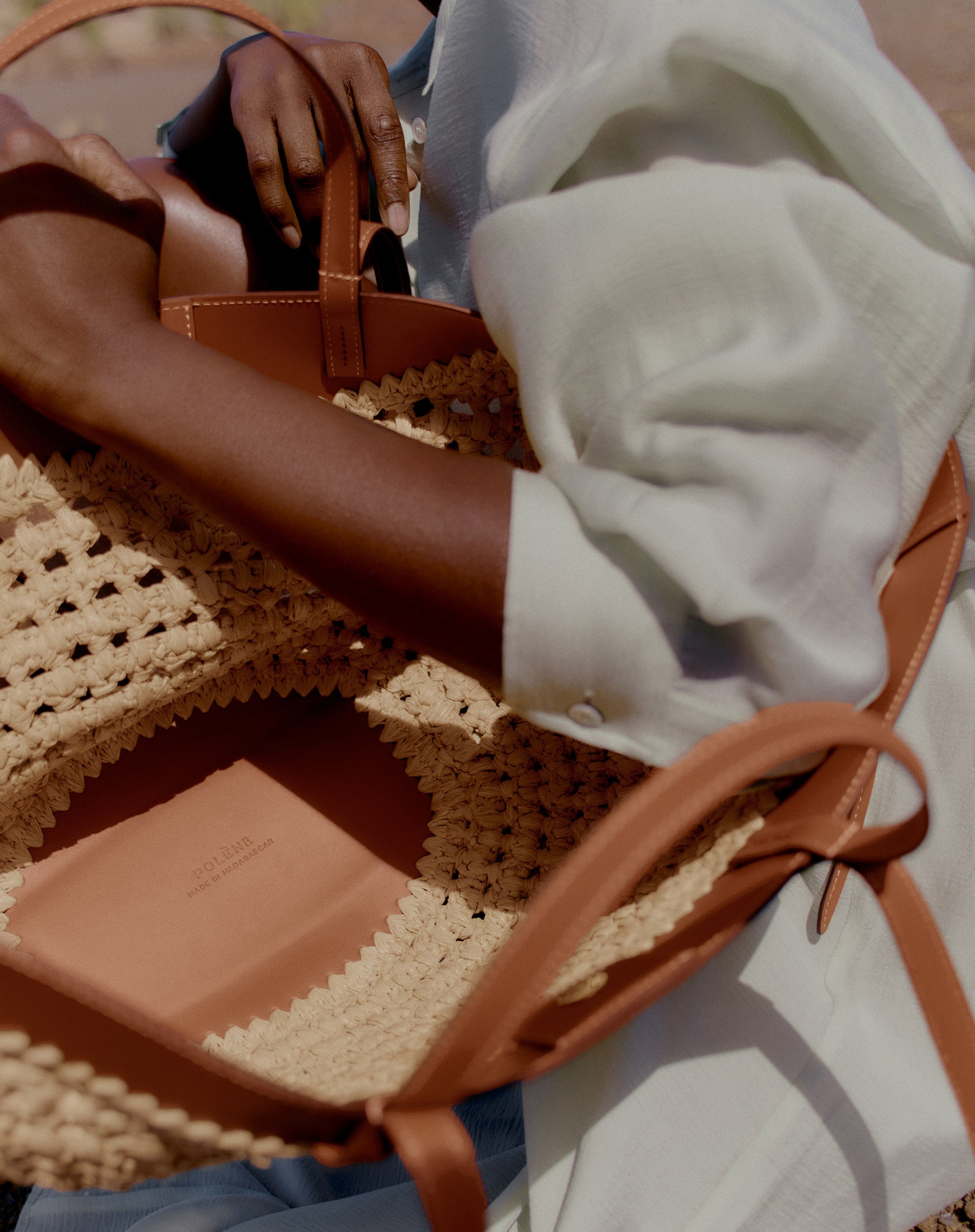 今回初めて、ポレーヌの3モデルに、しなやかにして強靱なこの植物素材が取り入れられることになりました。彫刻的なトートバッグに、そしてバスケットにと変身する「Cyme」と「Cyme Mini」では、クロシェの編み目の斬新な組み合わせによりラフィアでのドレスアップが実現。「Numéro Dix」でも、ライスステッチの技法を用い、ラフィア編みでハーフムーン型のフォルムを表現しています。どのバッグでも、レザーとラフィアとは、2つの素材の調和の取れたバランスを象徴する、手縫いのステッチで縫い合わされています。