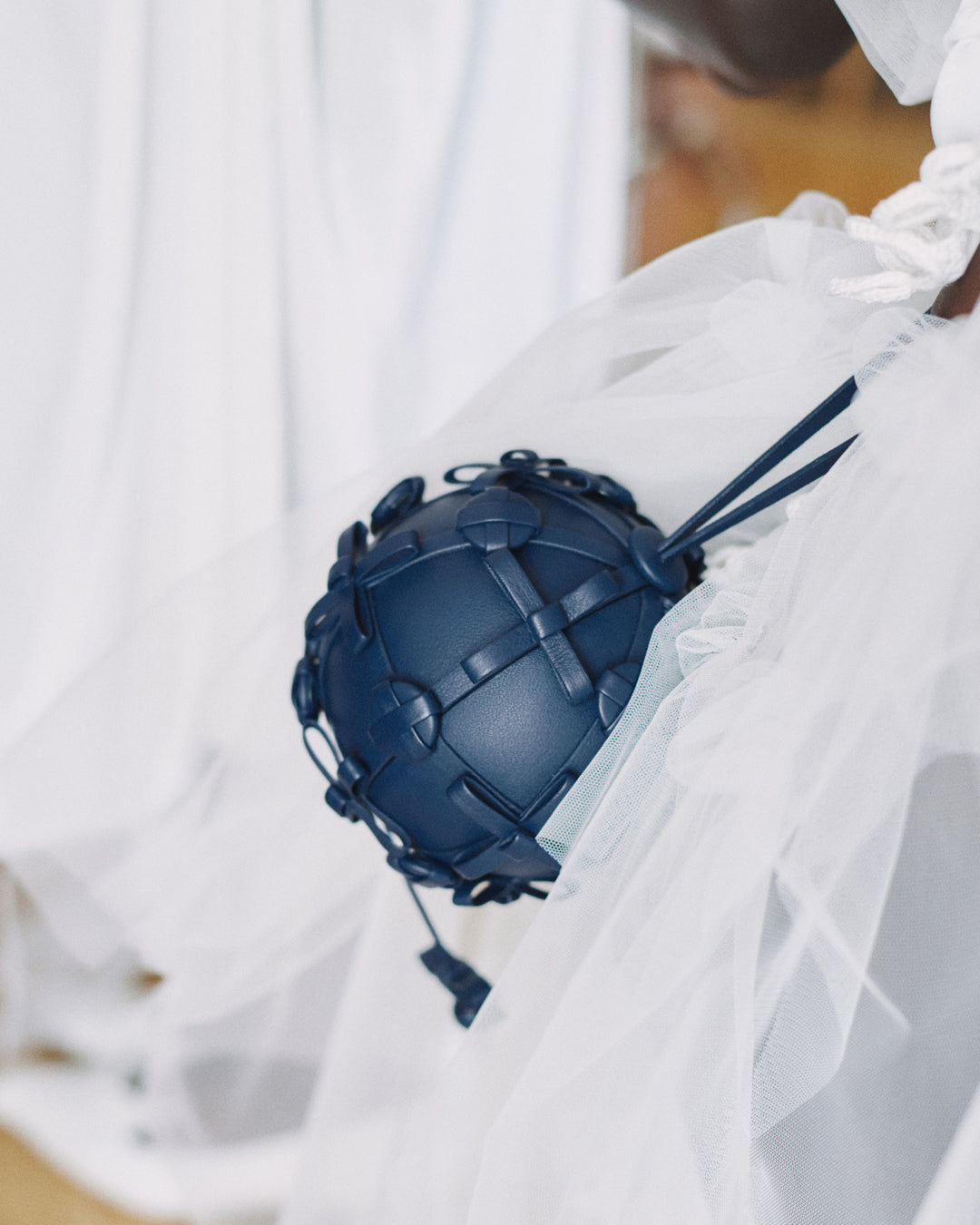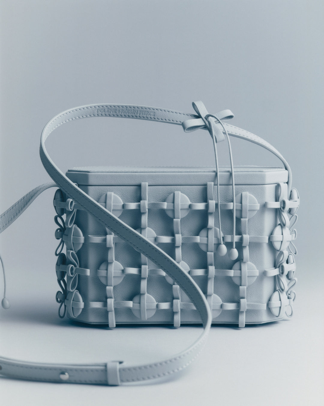 アートオブジェのようにデザインされたそれぞれの限定バッグは、複雑なボタンやリボンで飾られ、熟練した職人の手縫いによって、ロイシン ピアスのクリエイティブな世界と呼応するエレガントなグリッド模様に仕上げられています。
