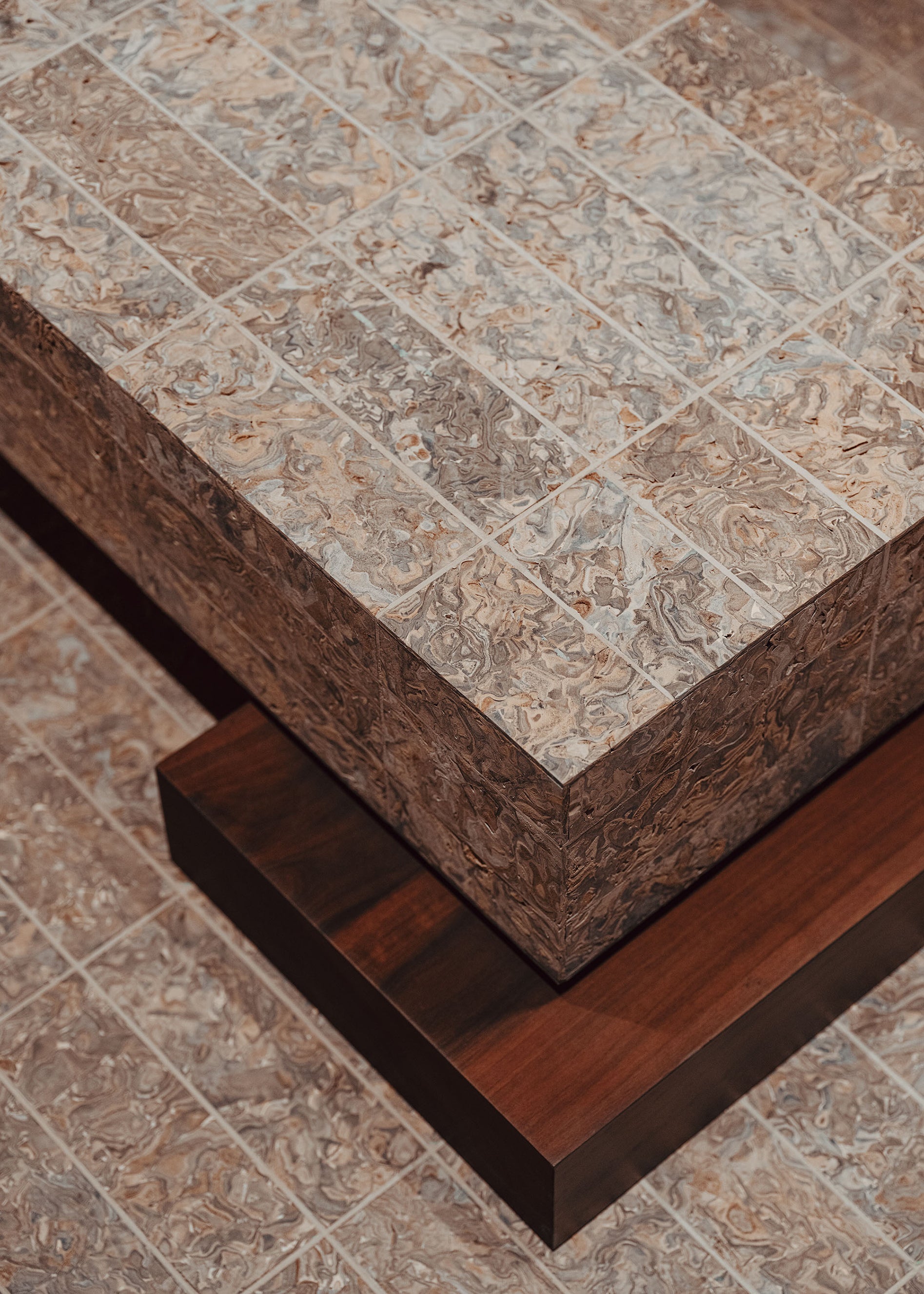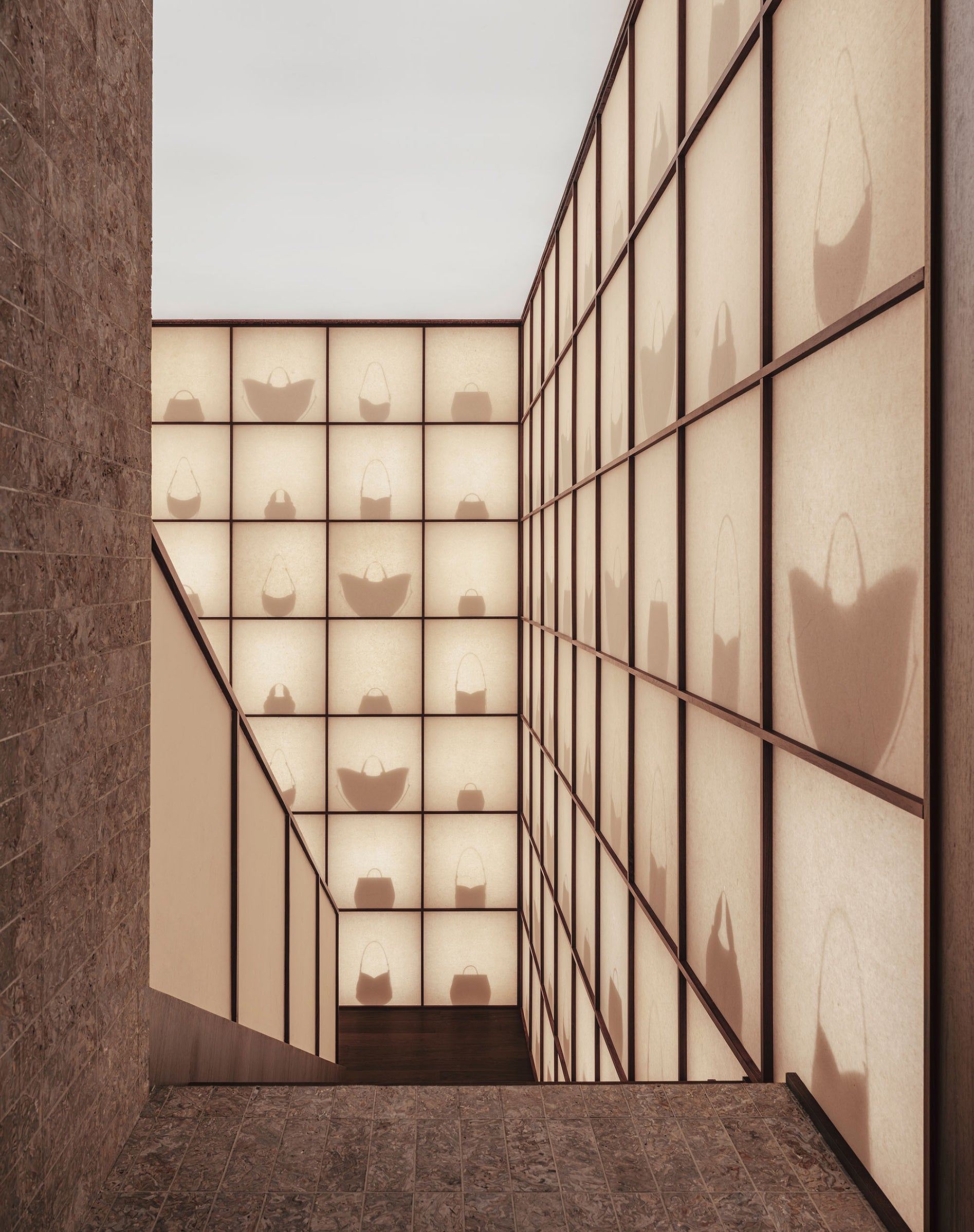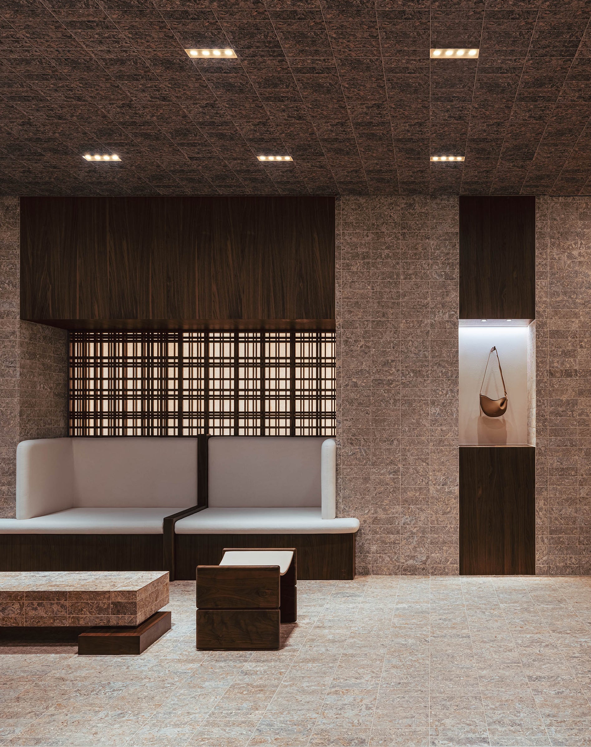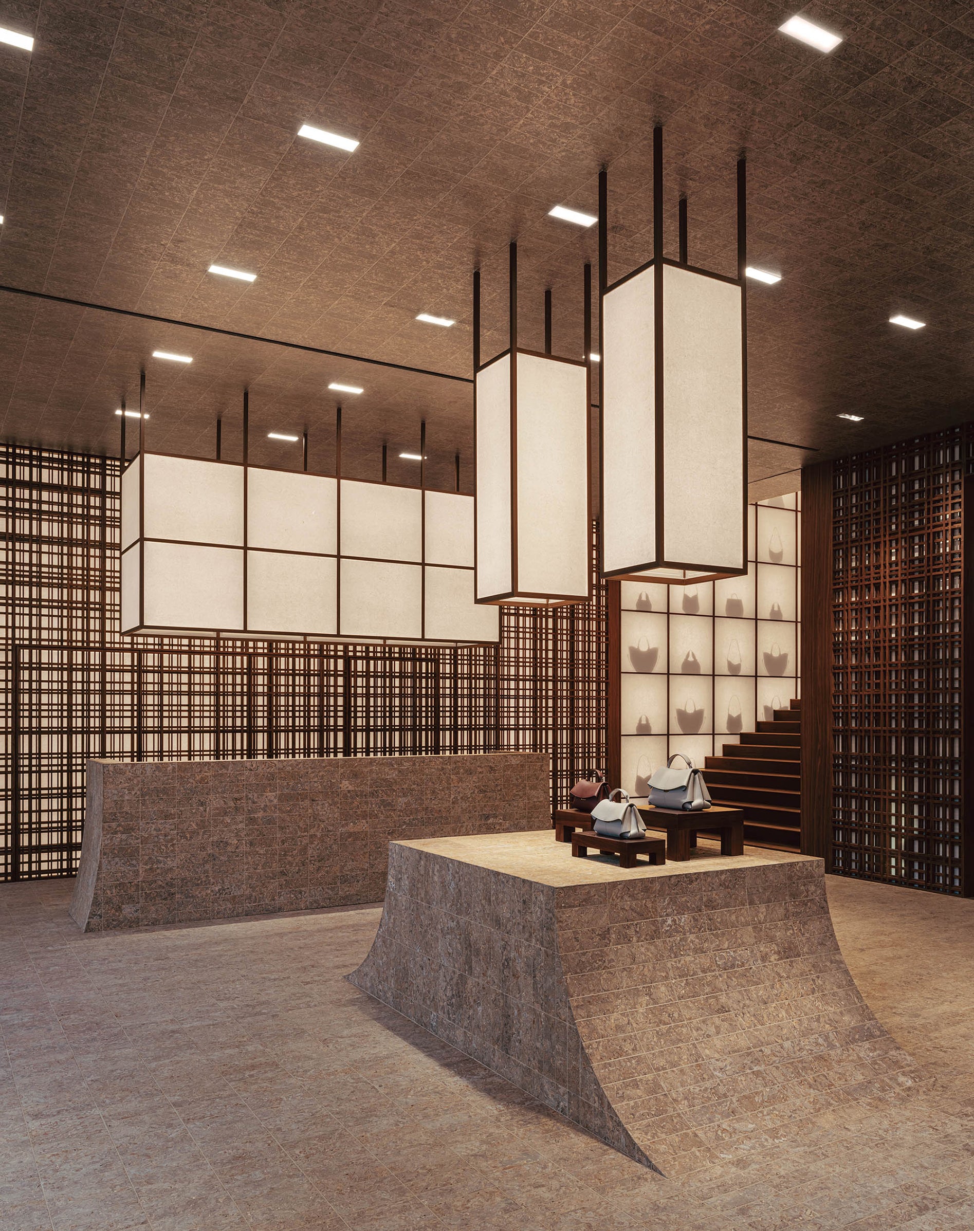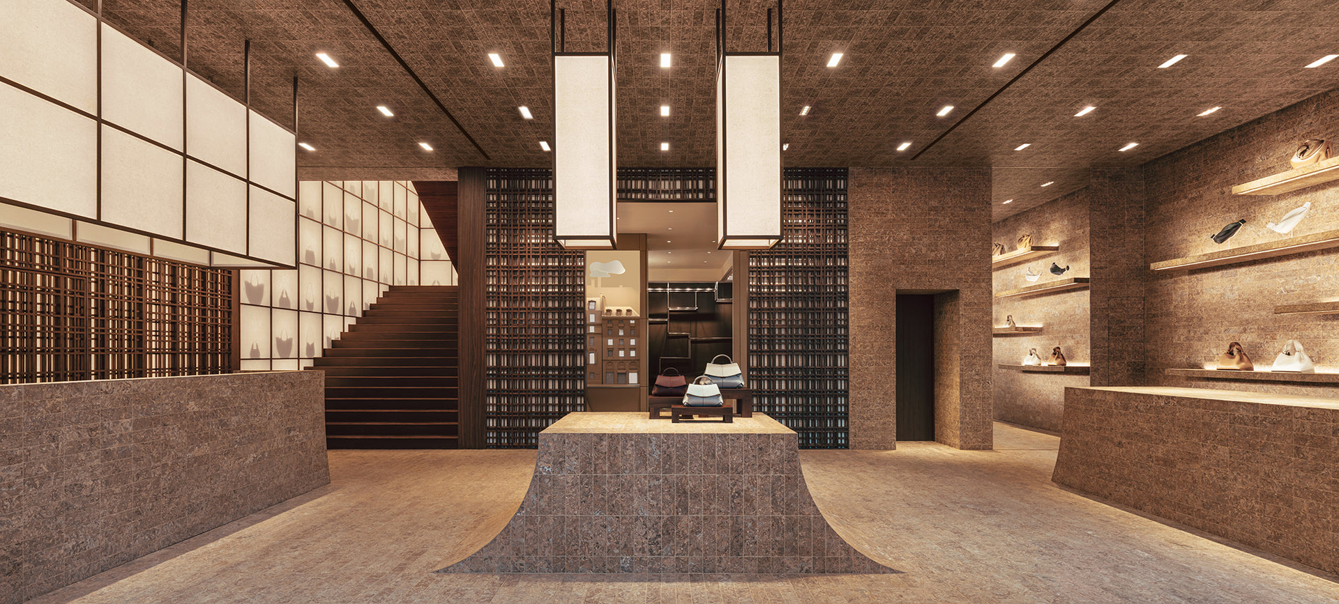 空間を形づくるように配された格子状のウォールナット材は、革や宣紙と静かに響き合い、やわらかな光をもたらしています。北京店のために用いられた総量約12トンの革の端切れは、圧縮加工によってレザーブリック素材へと生まれ変わりました。この革新的な素材は、鉱物を想起させる質感で空間に静謐さを添えています。中国の文化遺産をそっと映し出すのは、宣紙の存在。青檀の樹皮と稲わらを原料とする宣紙は、精緻な手仕事の工程を経て生まれ、その伝統技法は、世代を超えて口承で受け継がれてきました。