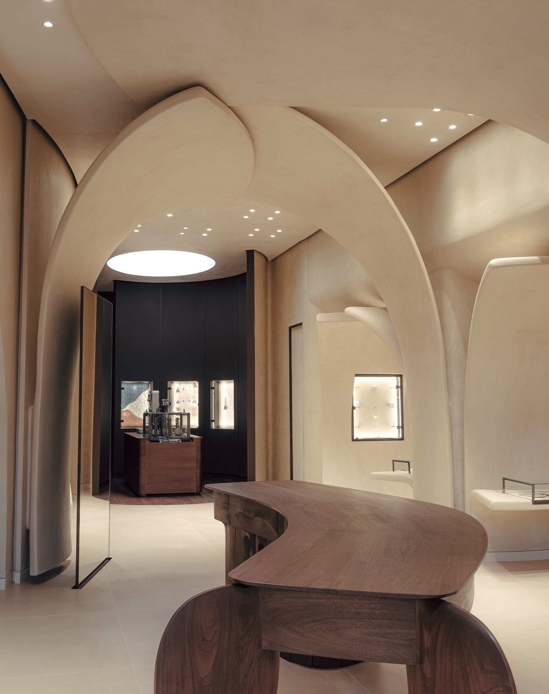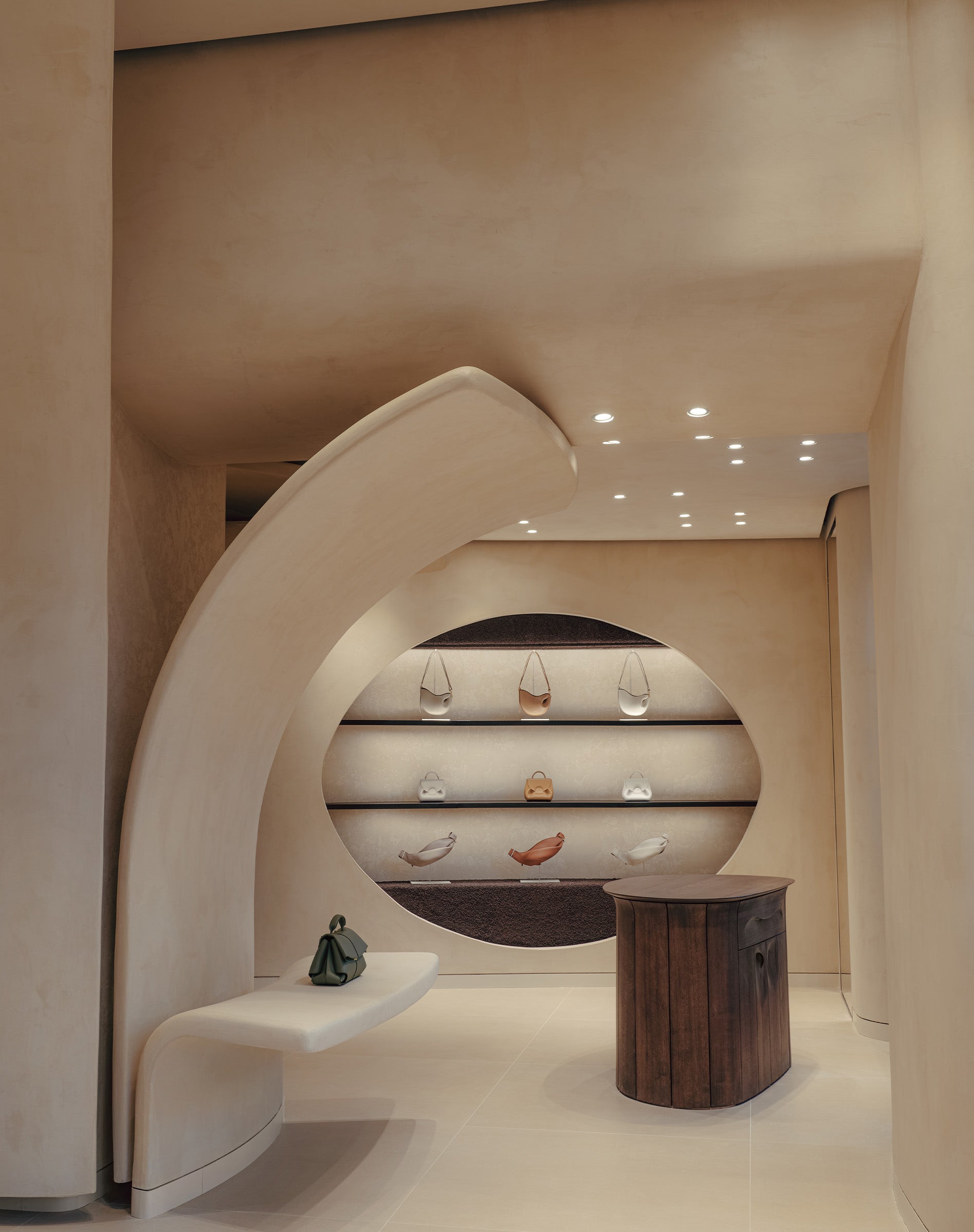 폴렌느는 현지 장인들과의 협업을 통해 고유한 창작 세계를 구현합니다. 건축가이자 조각가인 니콜라스 슈레이(Nicholas Shurey)는 유기적이면서 풍요로운 곡선미가 돋보이는 월넛 테이블 두 점을 제작했습니다. 또한, 디자인 연구소, 내추럴 머티리얼 스튜디오(Natural Material Studio)가 구상한 여섯 개의 백라이트 조명 구조물은 부드러운 빛을 발하며 진열된 가방에 섬세한 광채를 더해줍니다.