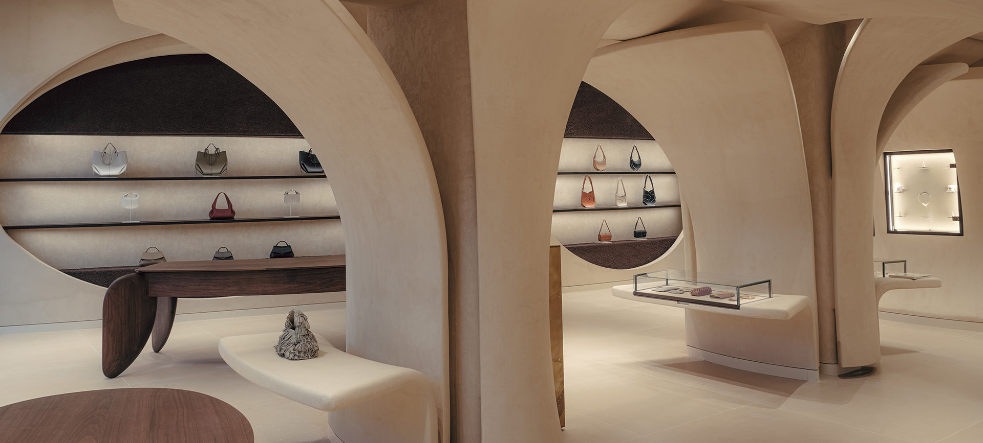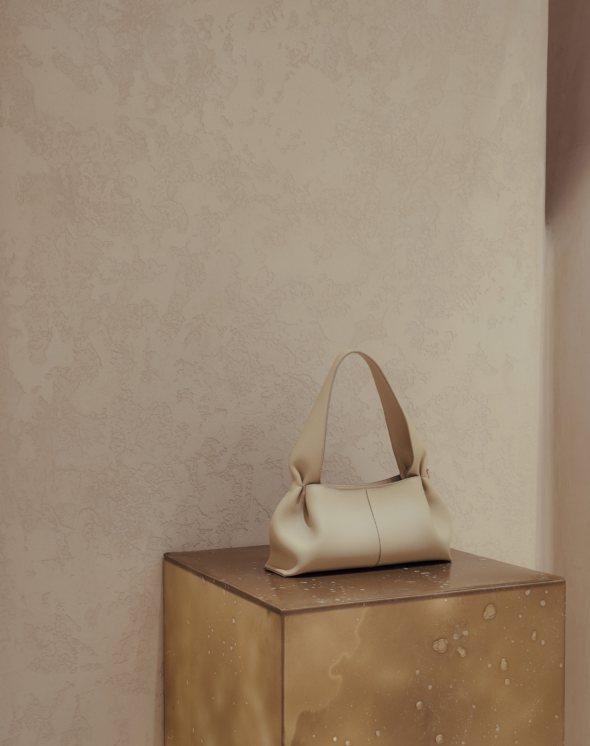 덴마크 수도의 중심부, 인드레 뷔 (Indre By)에 자리한 폴렌느 코펜하겐 플래그십 부티크는 공간의 볼륨, 빛, 소재가 부드럽게 어우러져 도시 속 은은한 안식처처럼 펼쳐집니다. 건물 디자인은 칼라꽃의 형상에서 영감을 받았습니다. 둥근 천장과 아치형 구조는 꽃잎처럼 우아하게 솟아오르고, 베이지와 브라운의 자연스러운 색조는 가죽과 조화를 이루며 공간에 따뜻한 리듬을 더합니다. 선반의 자수 디테일까지 그 정교함이 돋보이는 가죽 마감은 폴렌느 팀이 독자적으로 개발한 기법을 통해 완성되었습니다.