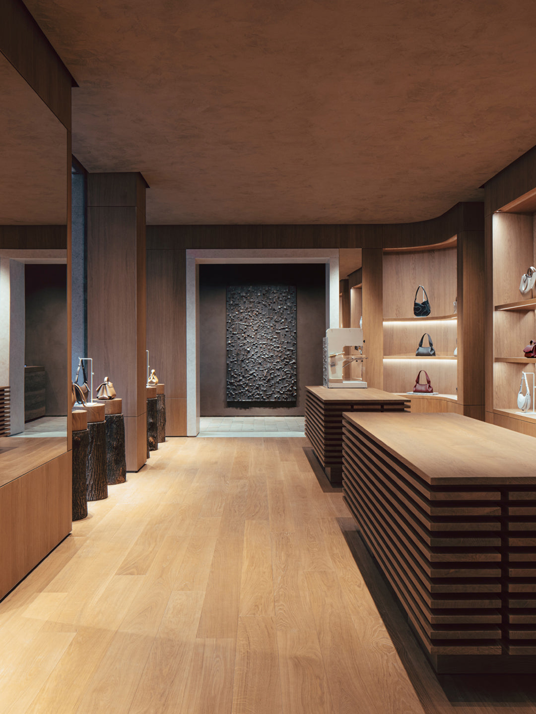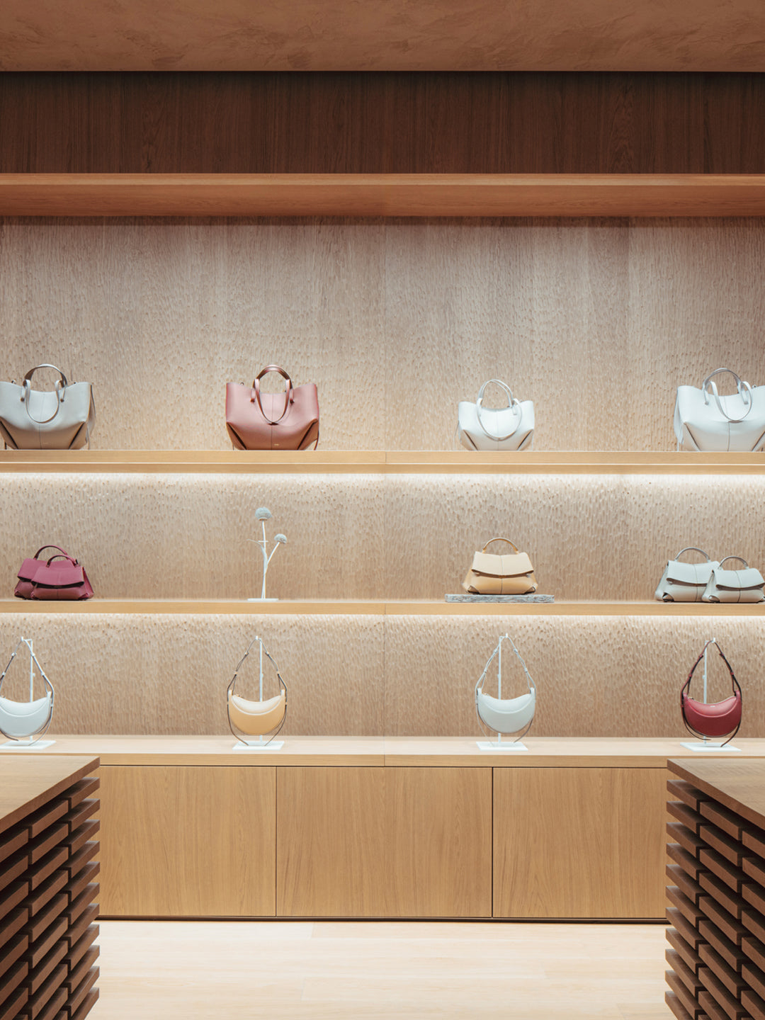 デンマークのスタジオNorm Architects(ノーム・アーキテクツ)によって設計されたこの店舗では、五感を刺激する店内経験をお楽しみいただけます。明るい色調から深みのあるトーンへと、奥へ進むにつれて徐々に雰囲気が移り変わります。無垢の状態から洗練された製品へと、それぞれの素材は色や質感とともに変化します。素材のあらゆる状態を探求し、店内を進むにつれて繊細なリズムが感じられるような空間づくりをポレーヌは目指しました。