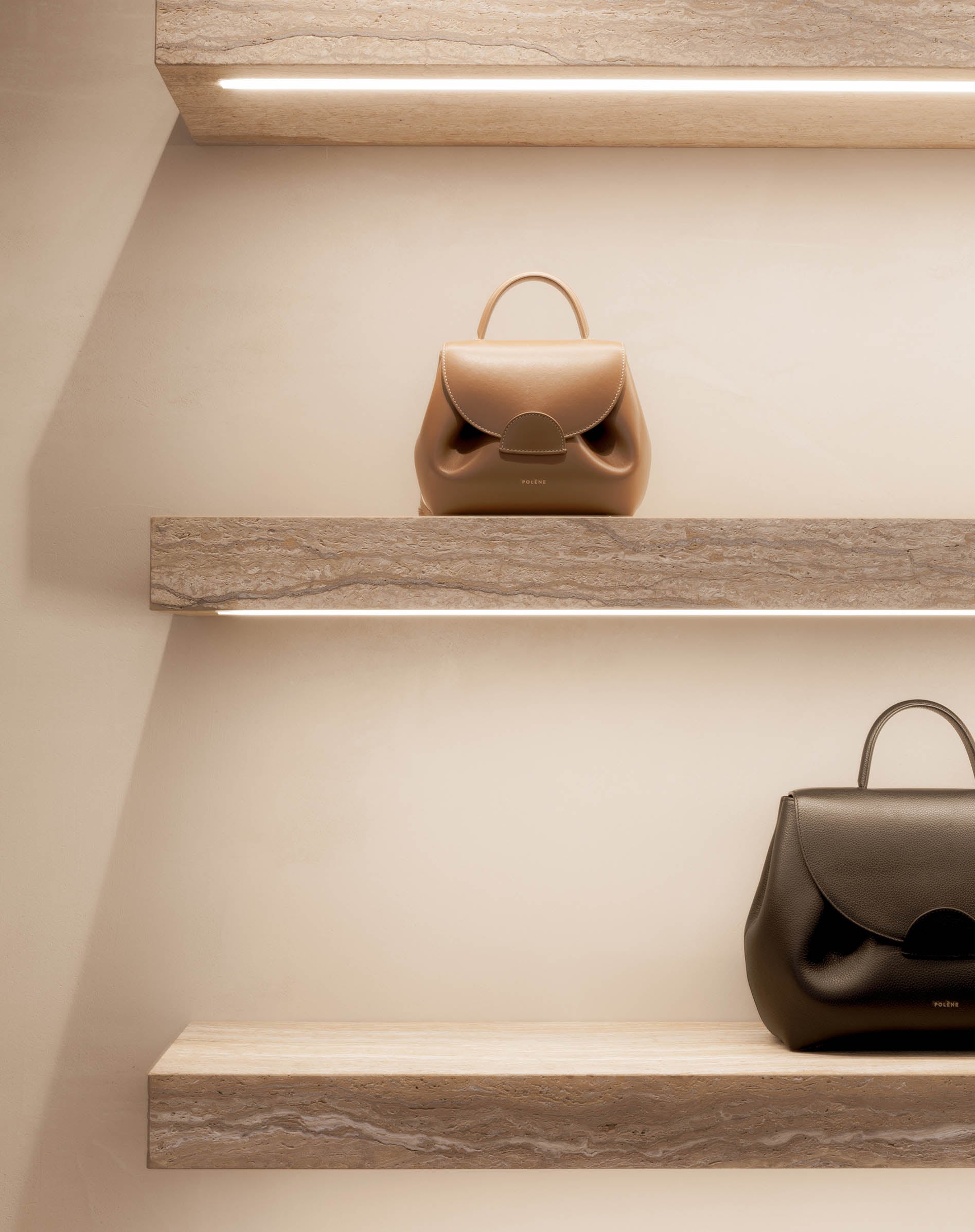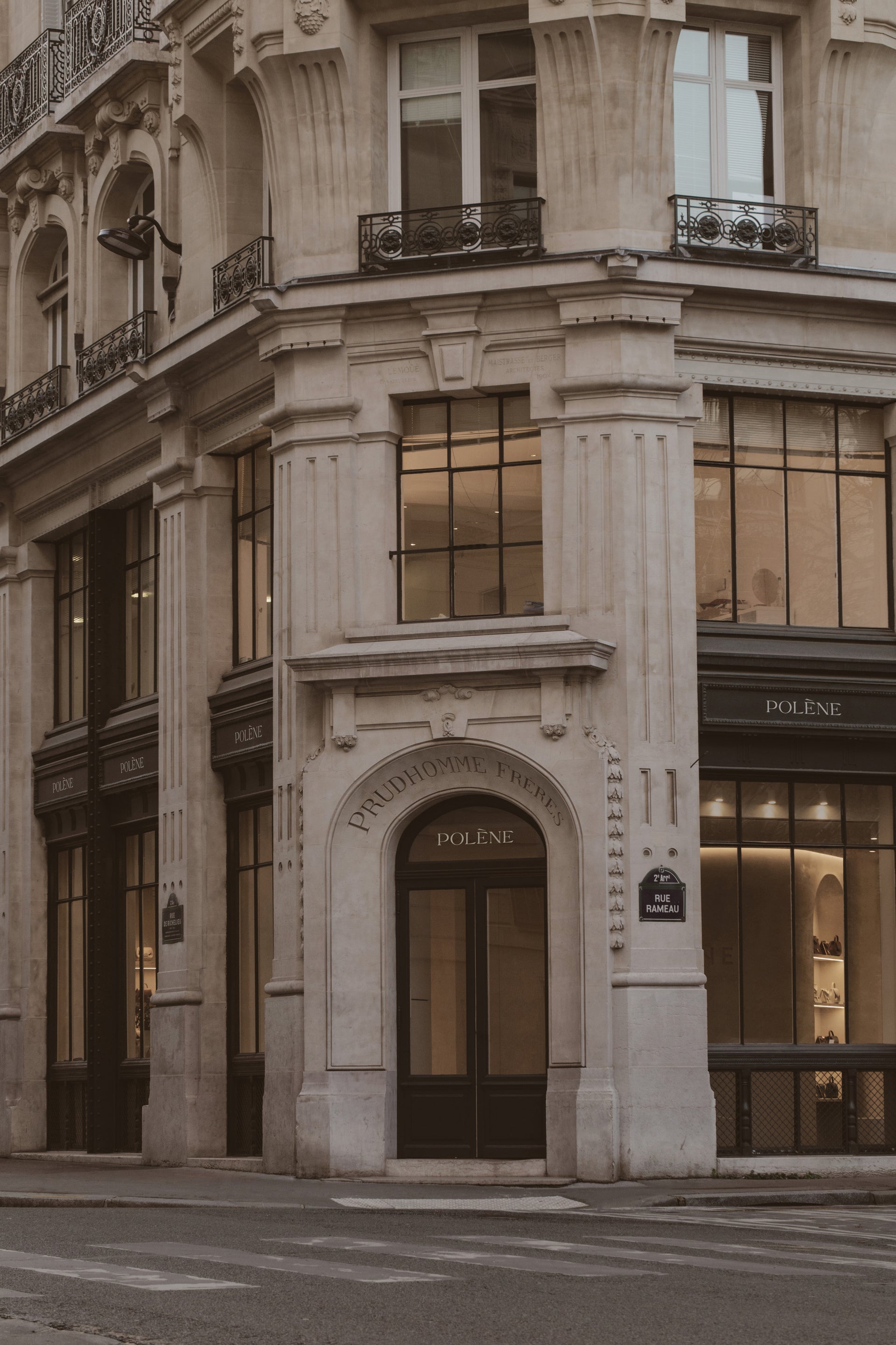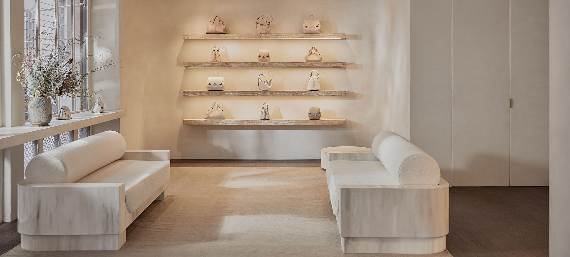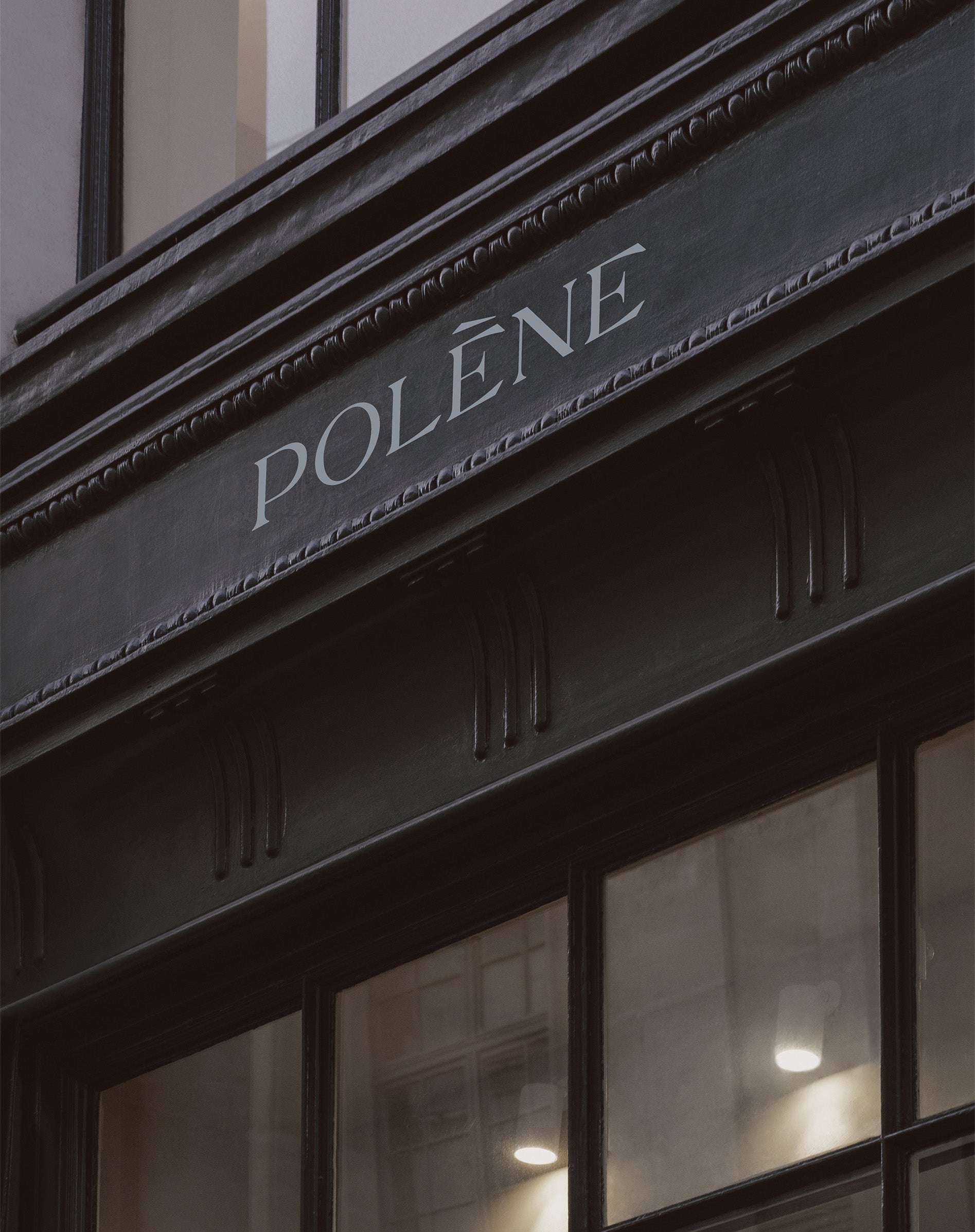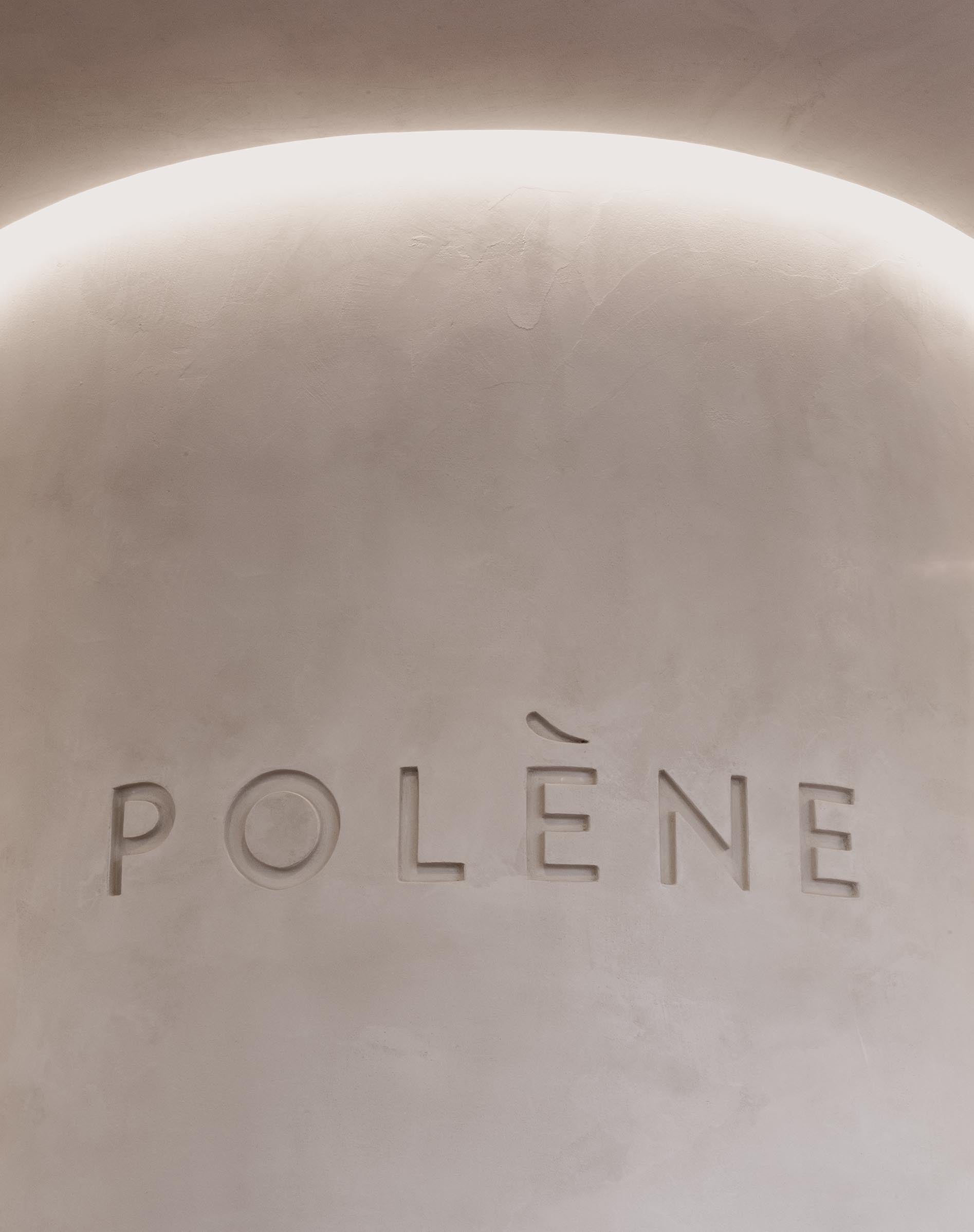 ブティックのエントランスには自然光が差し込み、柔らかく居心地の良い空間が、ポレーヌの名前が刻まれた柱の両側に広がります。