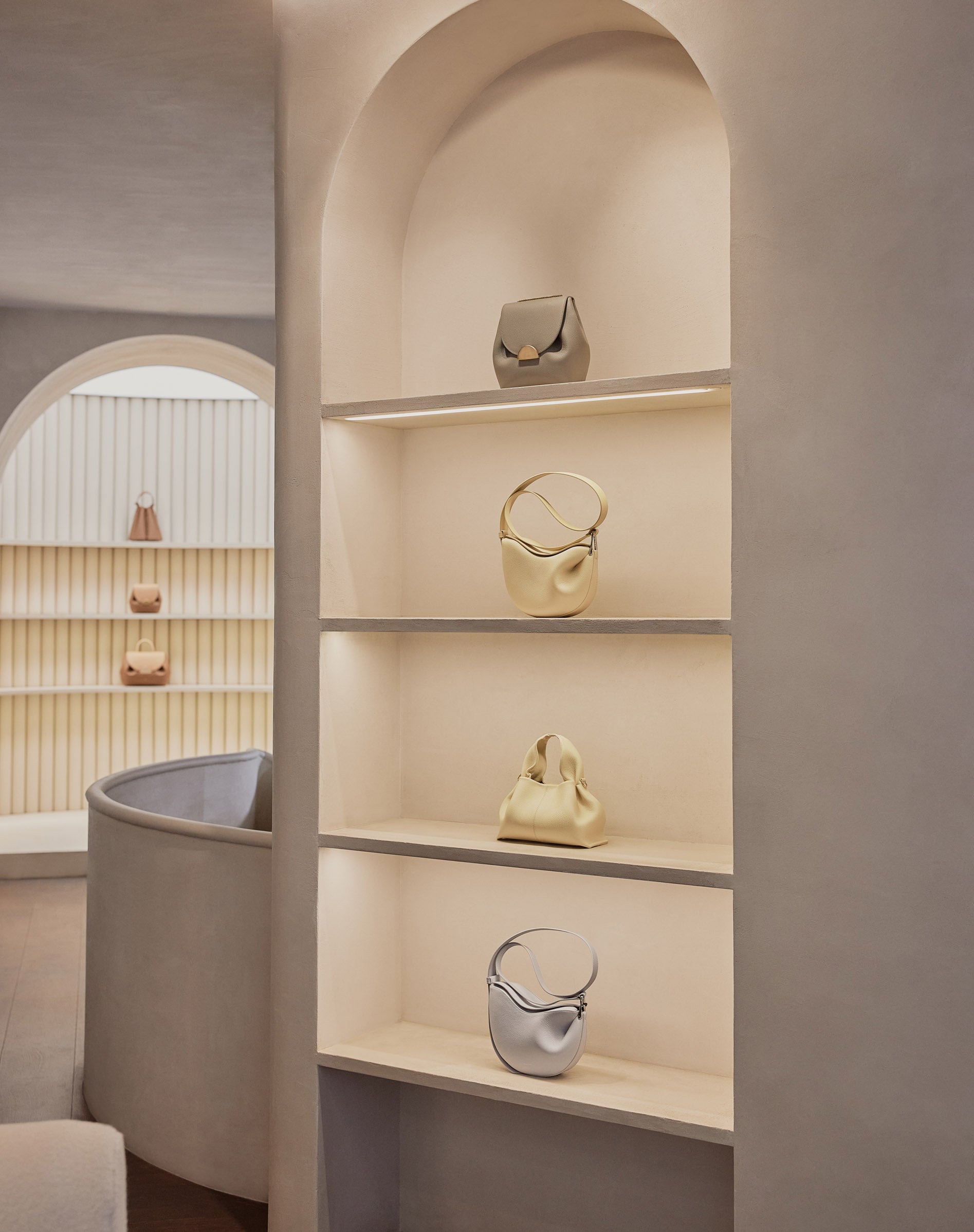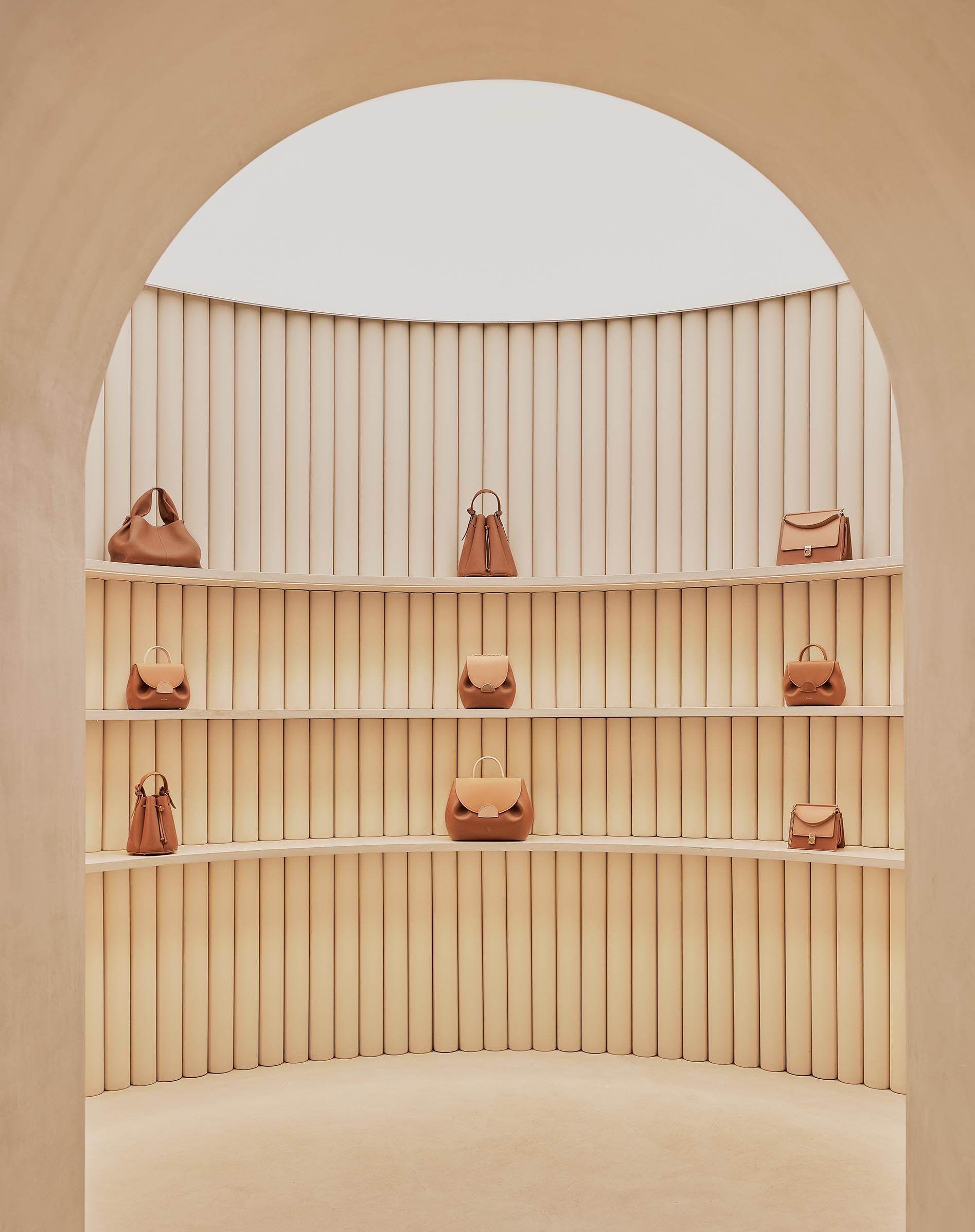 限定で制作されたアイテムがブティックを彩ります。 店舗の調度品はデストロイヤーズ/ビルダーズスタジオにより塗装、ラッカー処理が施され、絶妙な色合いのバリエーションを生み出しています。 壮大でありながら威厳を感じさせるニッチ空間は、プリーツのような筒状の革で光の輪を表現しています。"