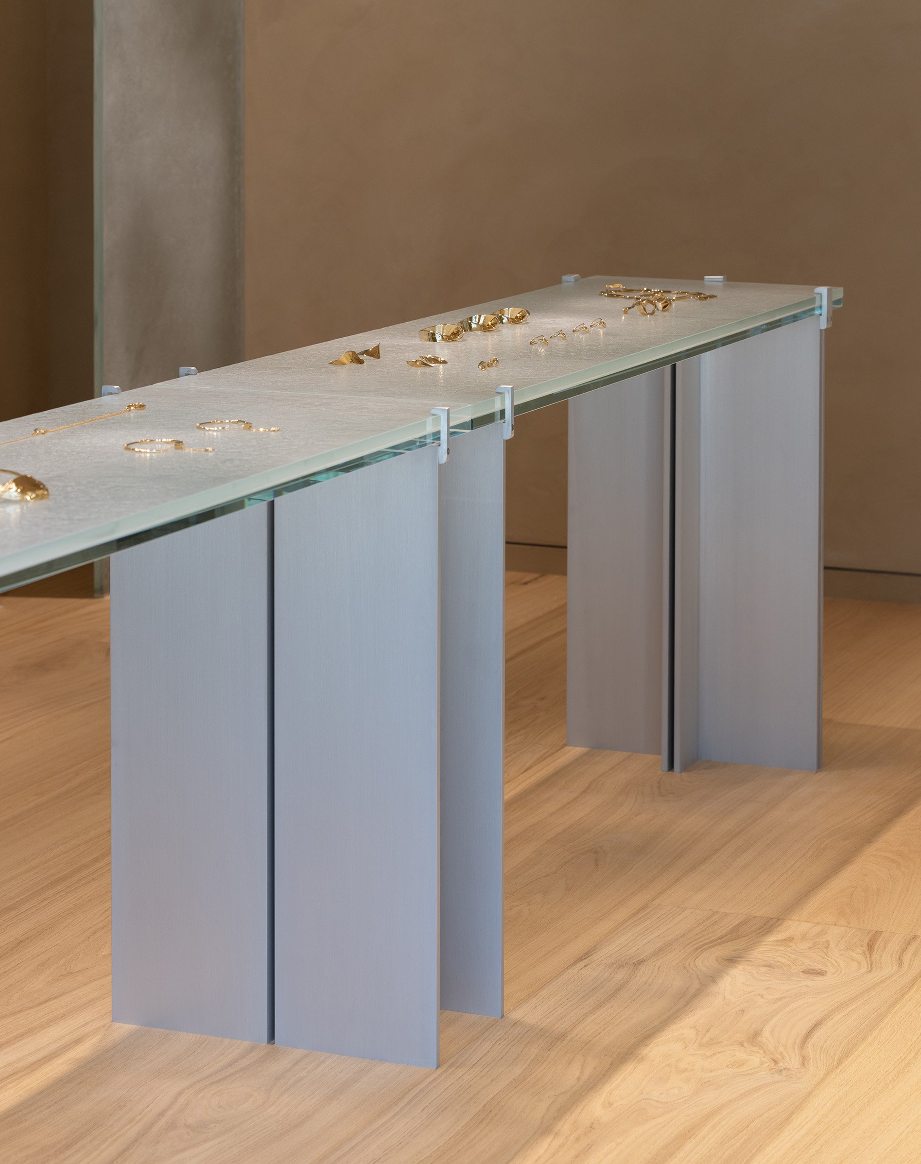 アトリエ・バロワのガラス職人達がデザインしたガラスのパネルとともに、階段は水の流れが表現されています。また、職人達とデザイナー、Johan Viladrichの合作による氷のような外観のガラステーブルがオーダーメイドで作られました。