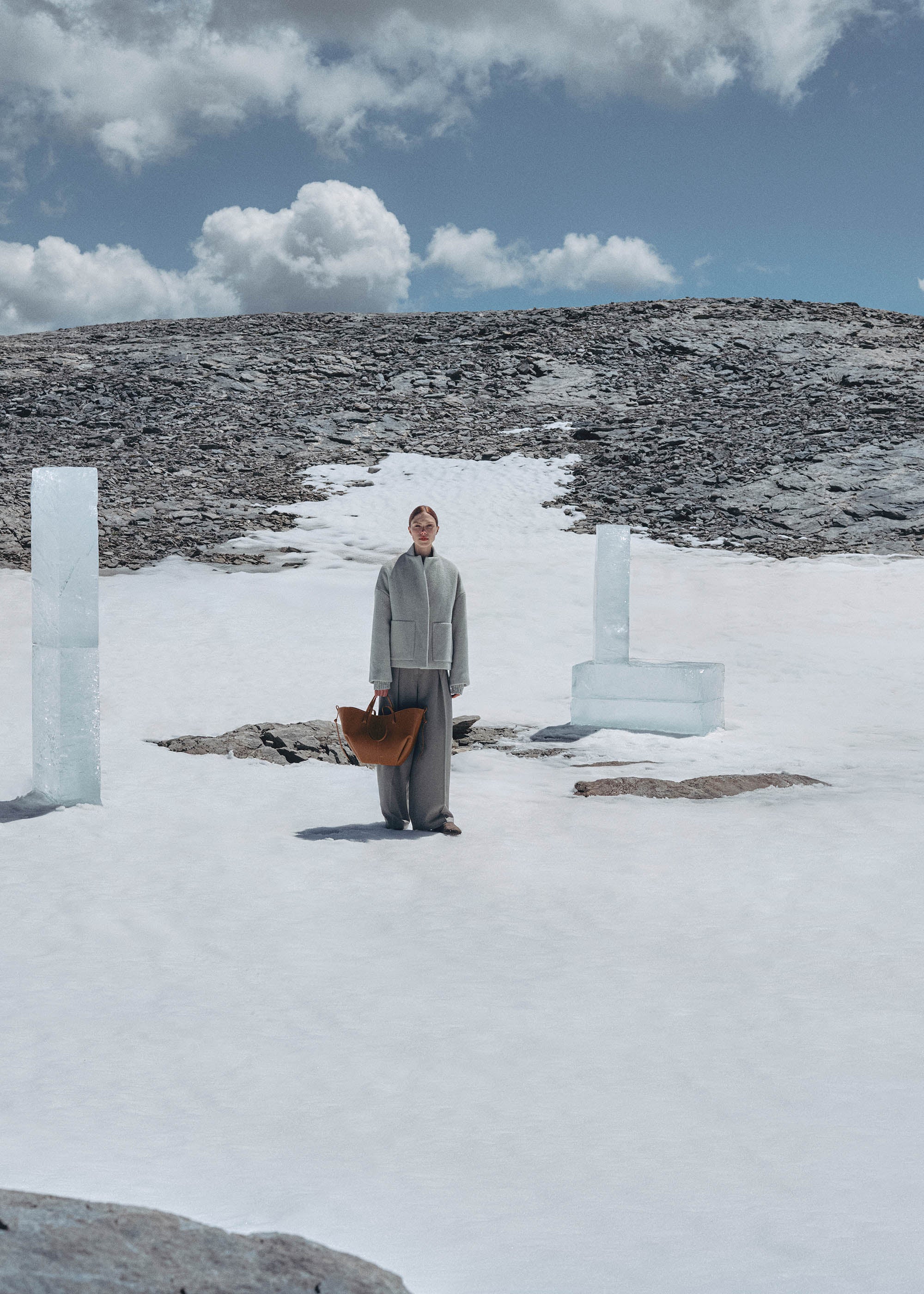 彫刻のようにデザインされたウェーブ、プリーツ、曲線が特徴的なカバは二通りの使い方ができます。ストラップを外に出し側面を開いた、バスケットスタイル。革紐とマグネットを使い側面を内側に折りたたみ、バッグの口を狭くすれば、より「フローラル」なスタイルに。