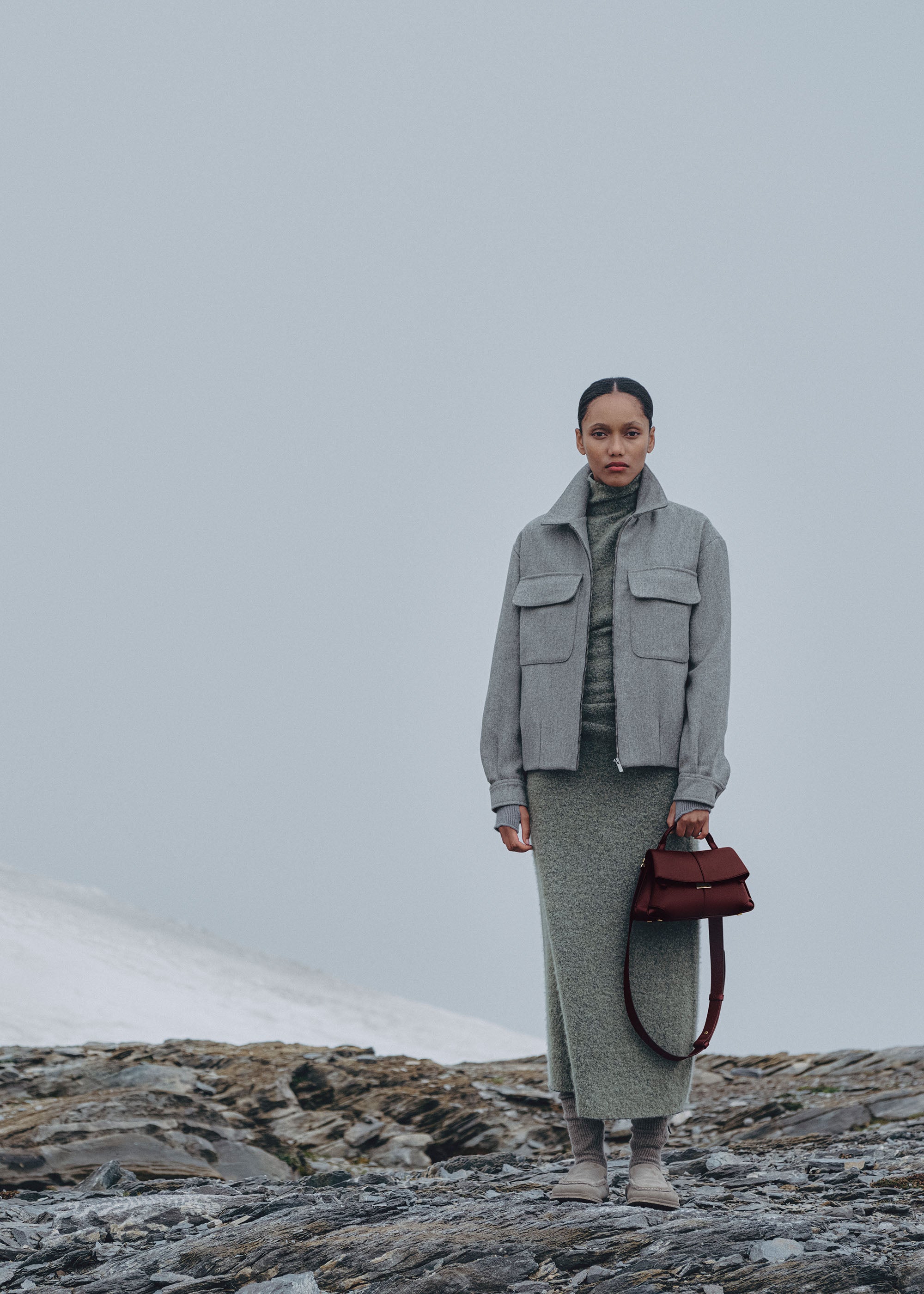 36枚のレザーを創意豊かに組み上げたモデル「Mokki Mini」では、テクスチャードレザーとスムースレザーの繊細な違いが楽しめる取り合わせの中に、プリーツの技の巧みさが光ります。刻印入りの留め具があしらわれたフラップを開けると、仕切りのついたスペースが現れます。スナップフックで固定するショルダーストラップは調節が可能。動きに合わせて、しなやかに身体に寄り添います。